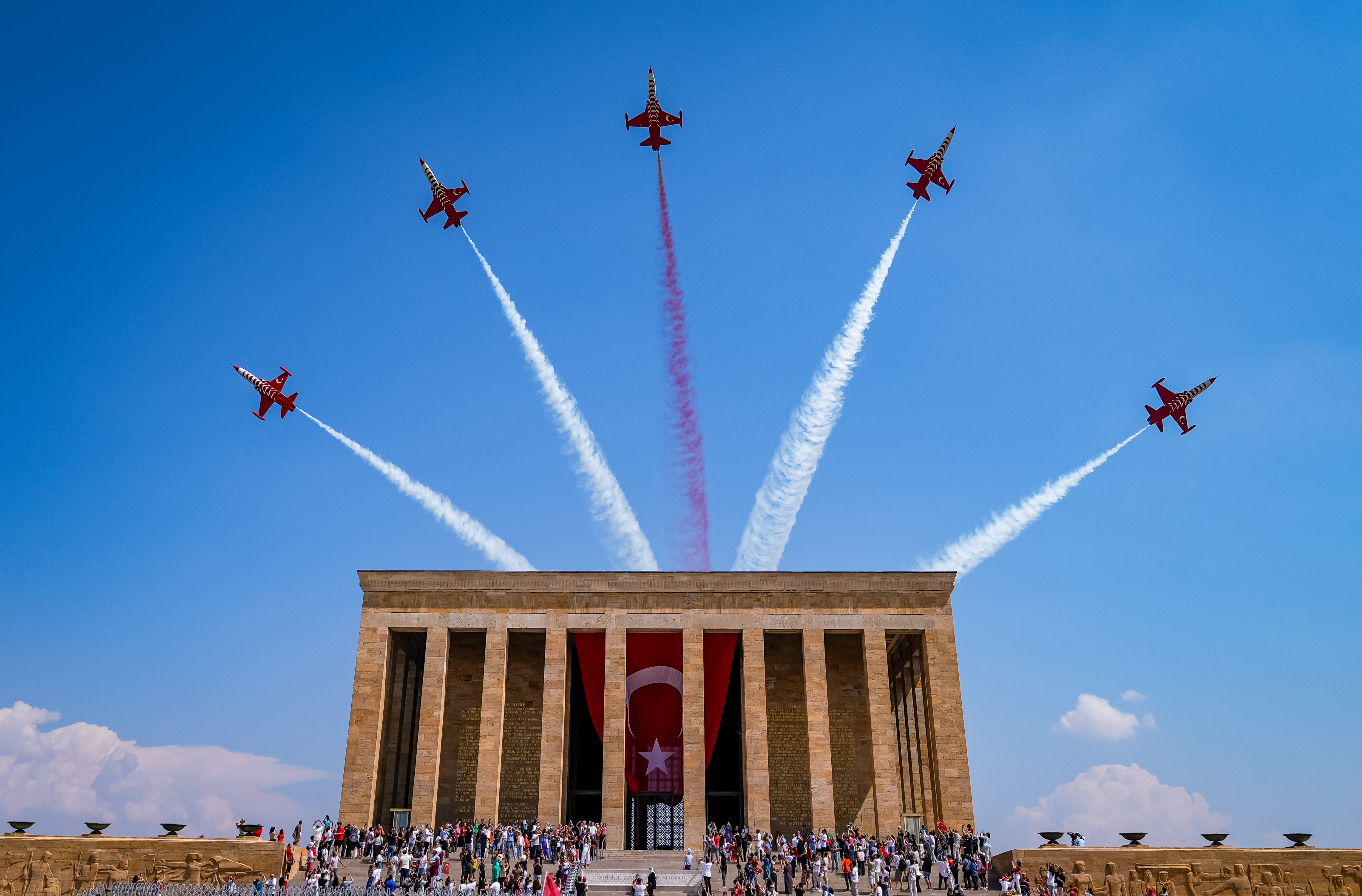 Turkish Stars, the acrobatic team of the Turkish Air Forces perform a flight around Anitkabir, the mausoleum of Turkish Republic's Founder Mustafa Kemal Ataturk, during the celebrations of 102nd anniversary of Victory Day and Turkish Armed Forces Day in Ankara, Turkiye on August 30, 2024. (Photo by Emin Sansar/Anadolu via Getty Images)