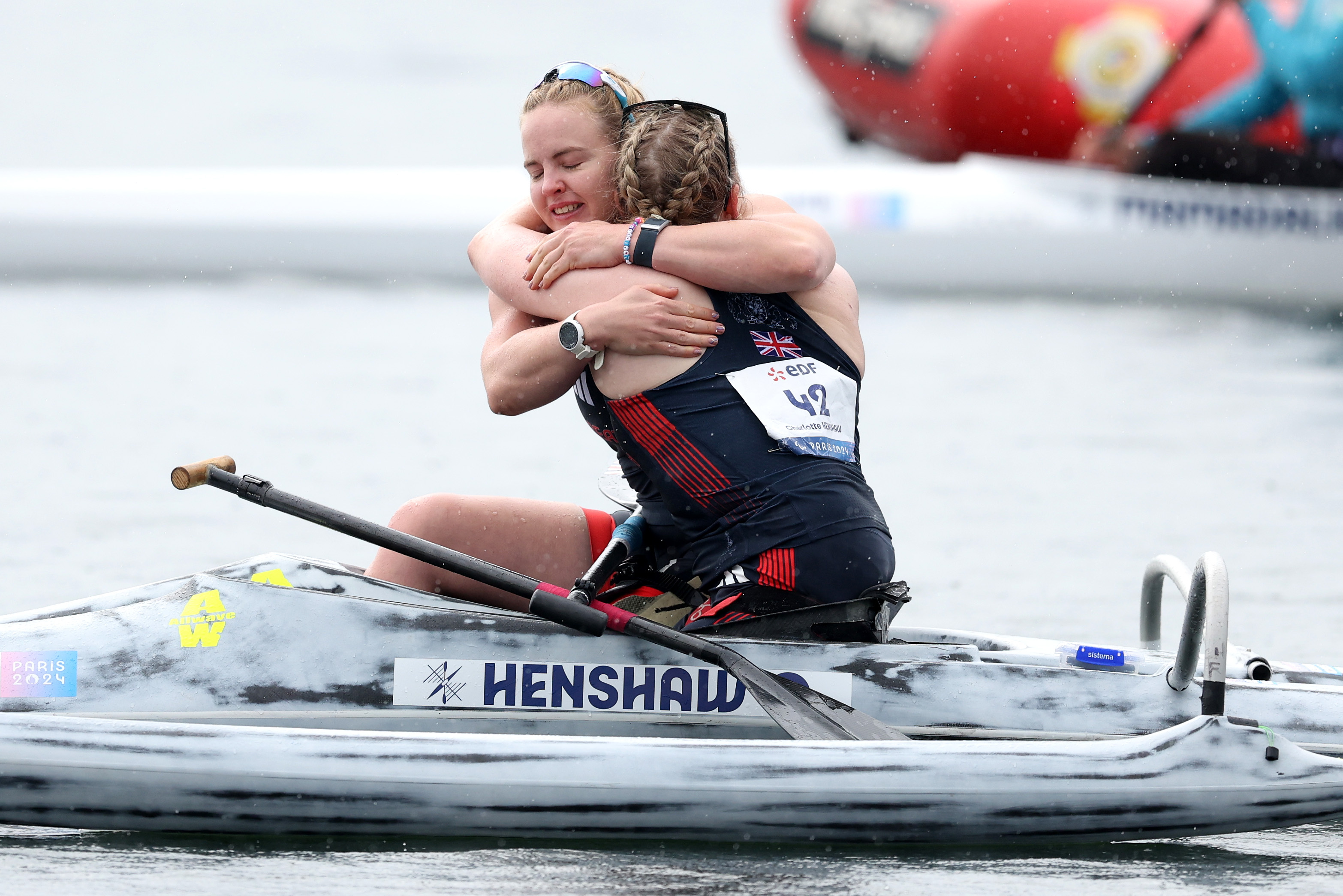 Gold Medalist, Charlotte Henshaw of Team Great Britain and silver medalist, Hope Gordon of Team Great Britain celebrate the following Women's Va'a Single 200m - VL3 Final A on day ten of the Paris 2024 Summer Paralympic Games at Vaires-Sur-Marne Nautical Stadium on September 07, 2024 in Paris, France. (Photo by Steph Chambers/Getty Images)