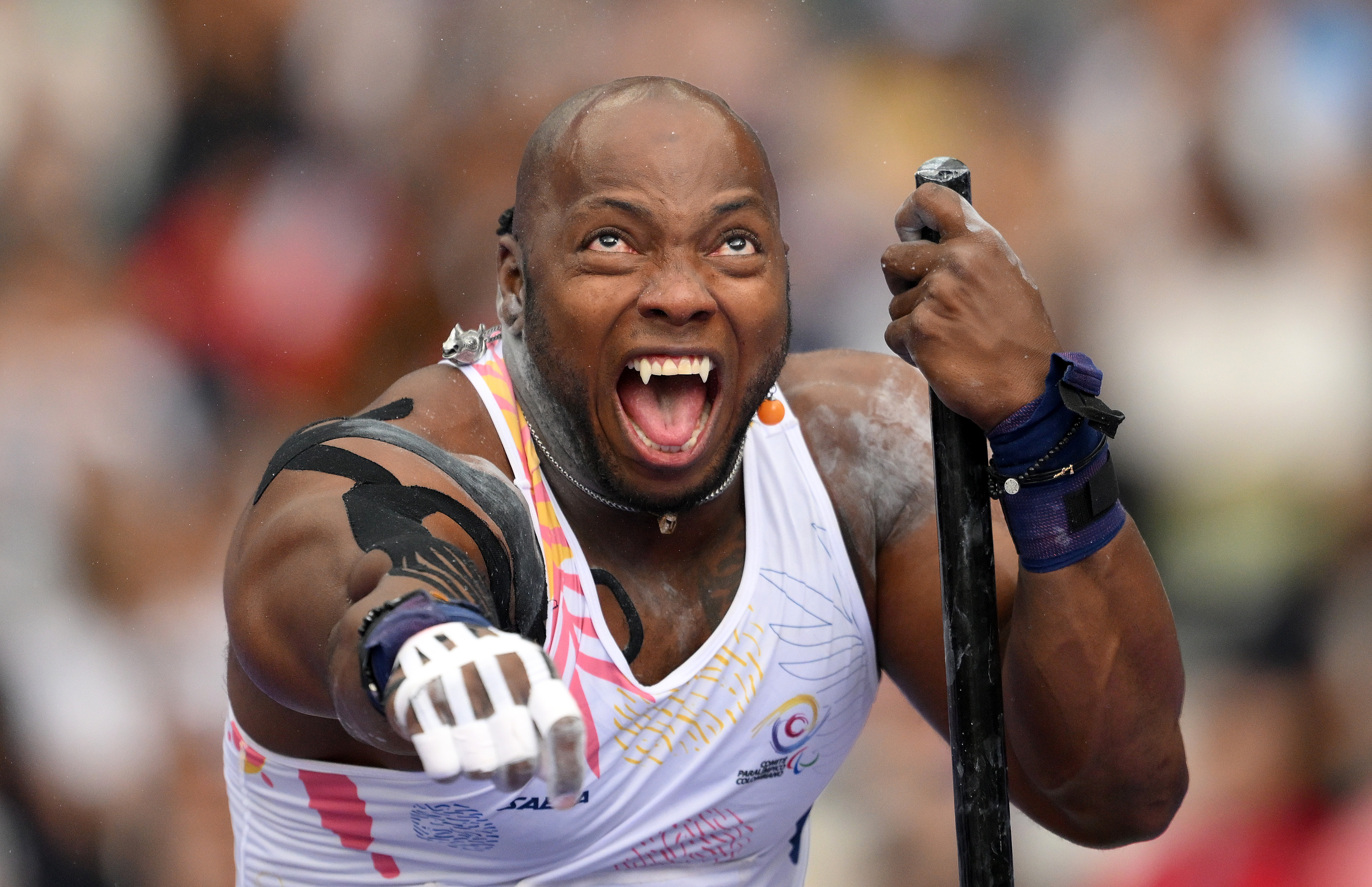 Mauricio Valencia of Team Colombia celebrates moving into first place during the Men's Shot Put - F34 Final on day ten of the Paris 2024 Summer Paralympic Games at Stade de France on September 07, 2024 in Paris, France. (Photo by David Ramos/Getty Images)