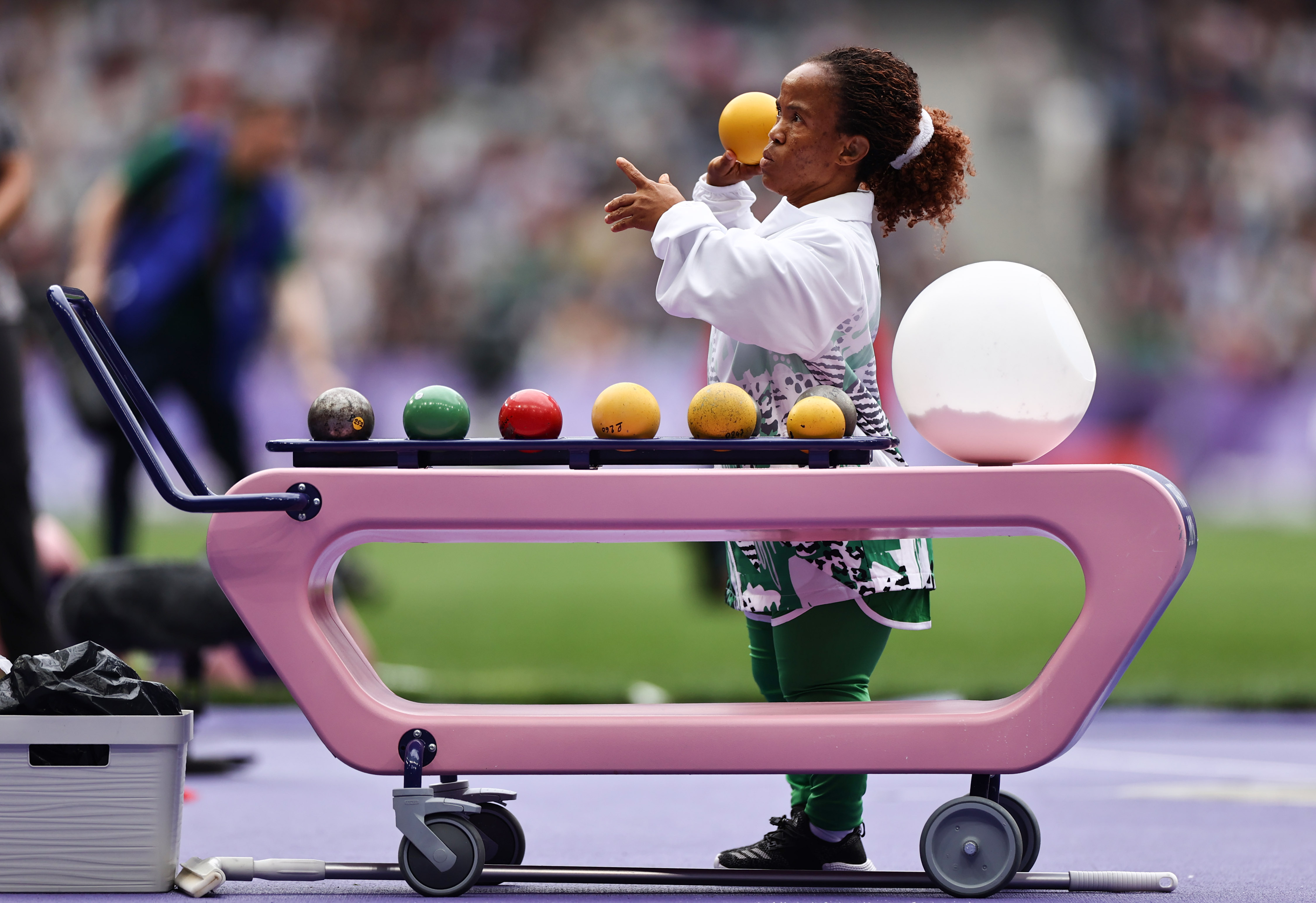 Nigeria shot putter Lauritta Onye selects her shot during the F40 final at Stade de France in Paris, France on September 7, 2024. (Photo by Tom Maher/INPHO/Rex Features/Shutterstock)