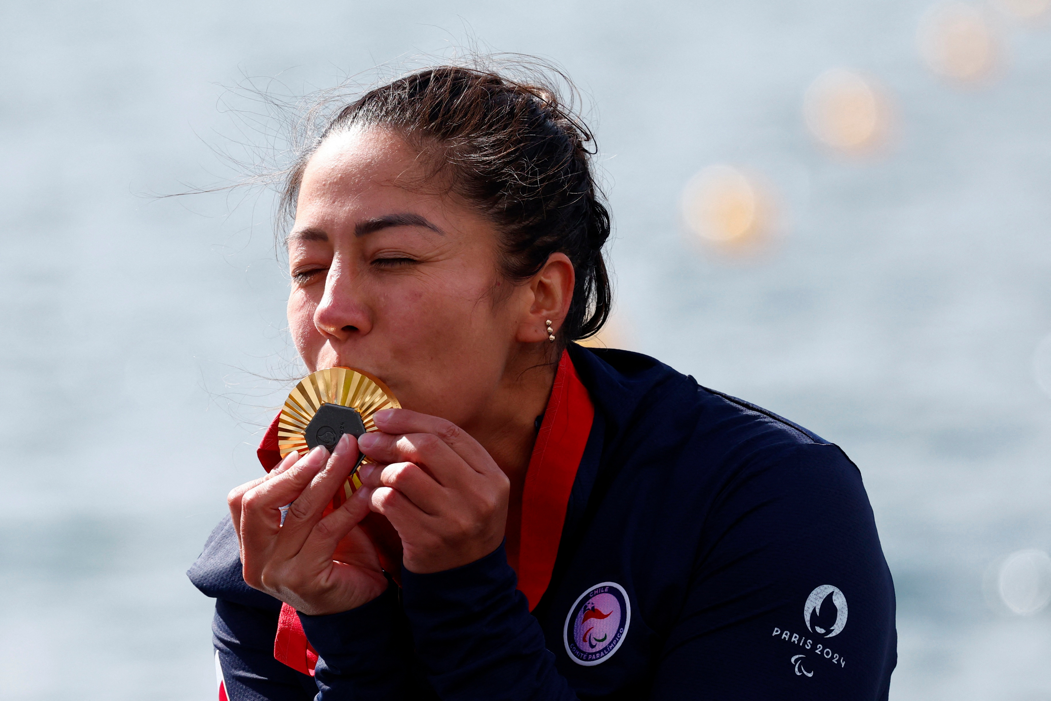 Katherinne Wollermann of Chile kisses her medal after winning gold in the women’s KL1 200m Kayak at Vaires-sur-Marne Nautical Stadium in Flatwater, Vaires-sur-Marne, France on September 8, 2024. (Photo by Gonzalo Fuentes/Reuters)