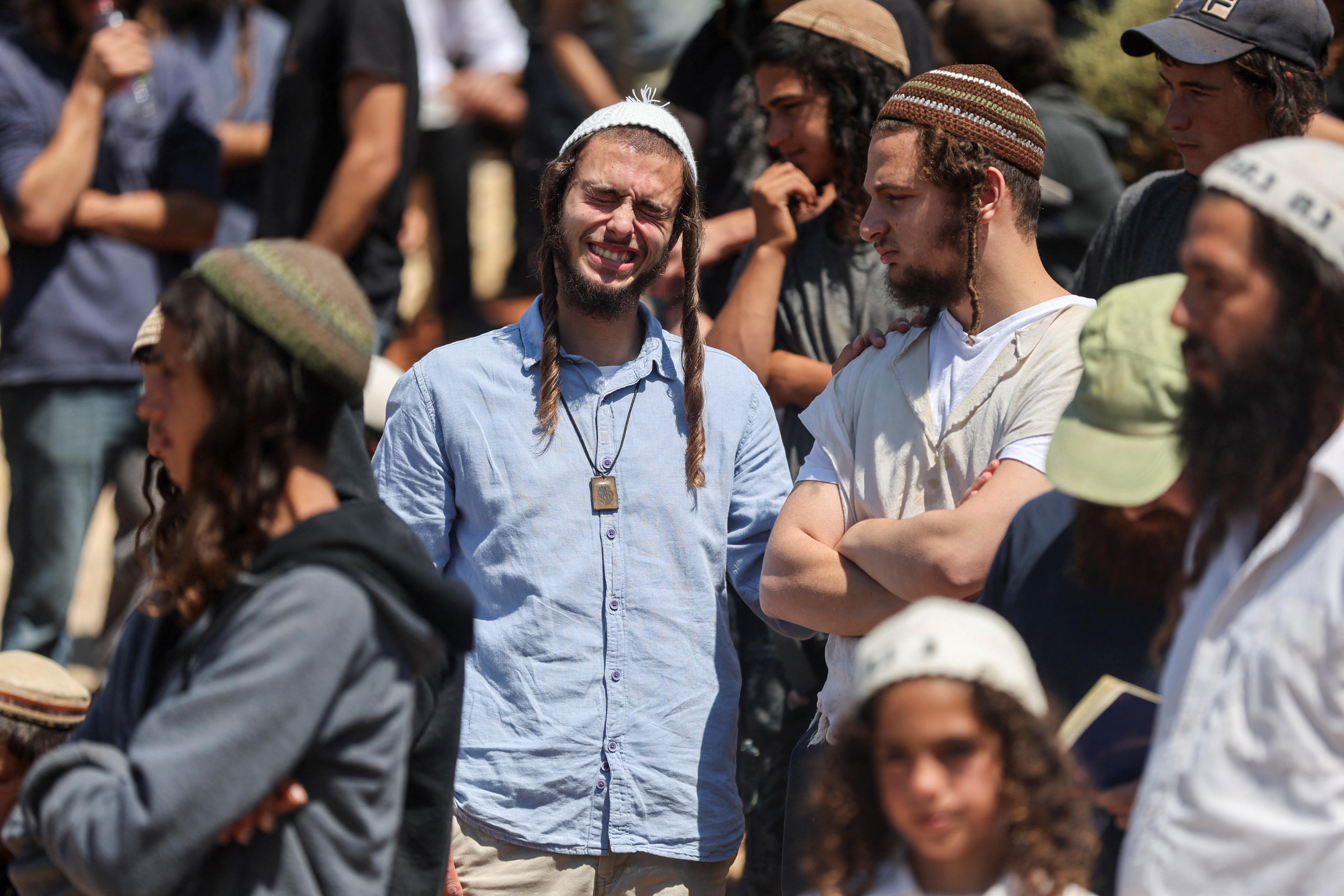 A man reacts, as friends and family mourn 17-year-old Nachman Shmuel Mordoff, who was killed in a Palestinian shooting attack along with three other Israelis near the Jewish settlement of Eli, at his funeral in Shilo in the Israeli-occupied West Bank on June 21, 2023. (Photo by Nir Elias/Reuters)