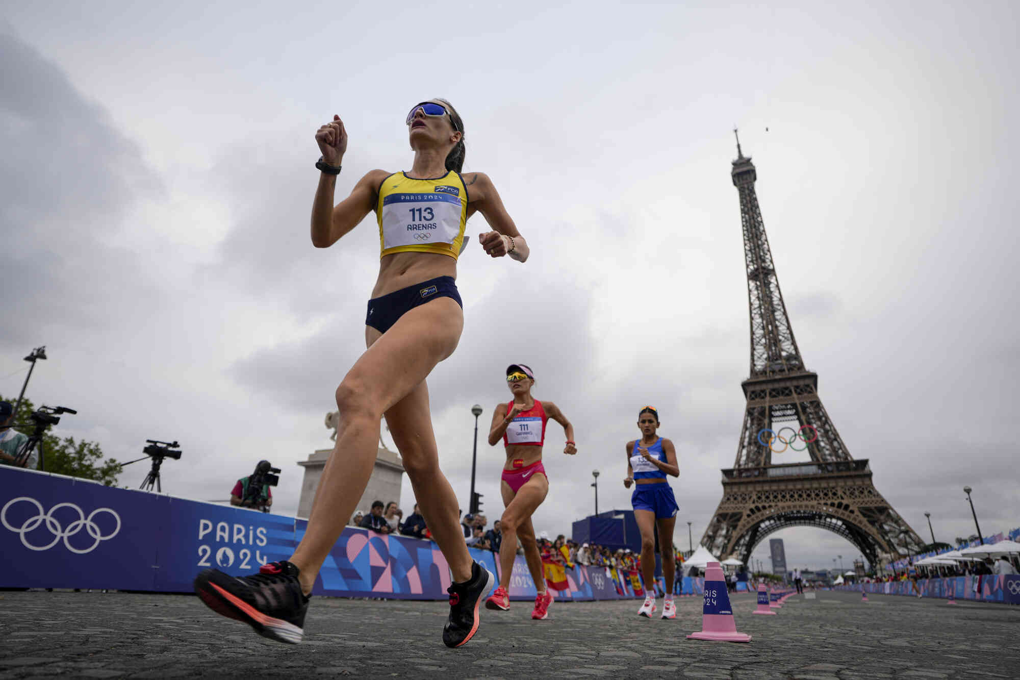 Columbia's Lorena Arenas (113), China's Qieyang Shijie (111) and Hungary's Rita Recsei (133) compete during the marathon race walk relay mixed at the 2024 Summer Olympics, Wednesday, August 7, 2024, in Paris, France. (Photo by Vadim Ghirda/AP Photo)