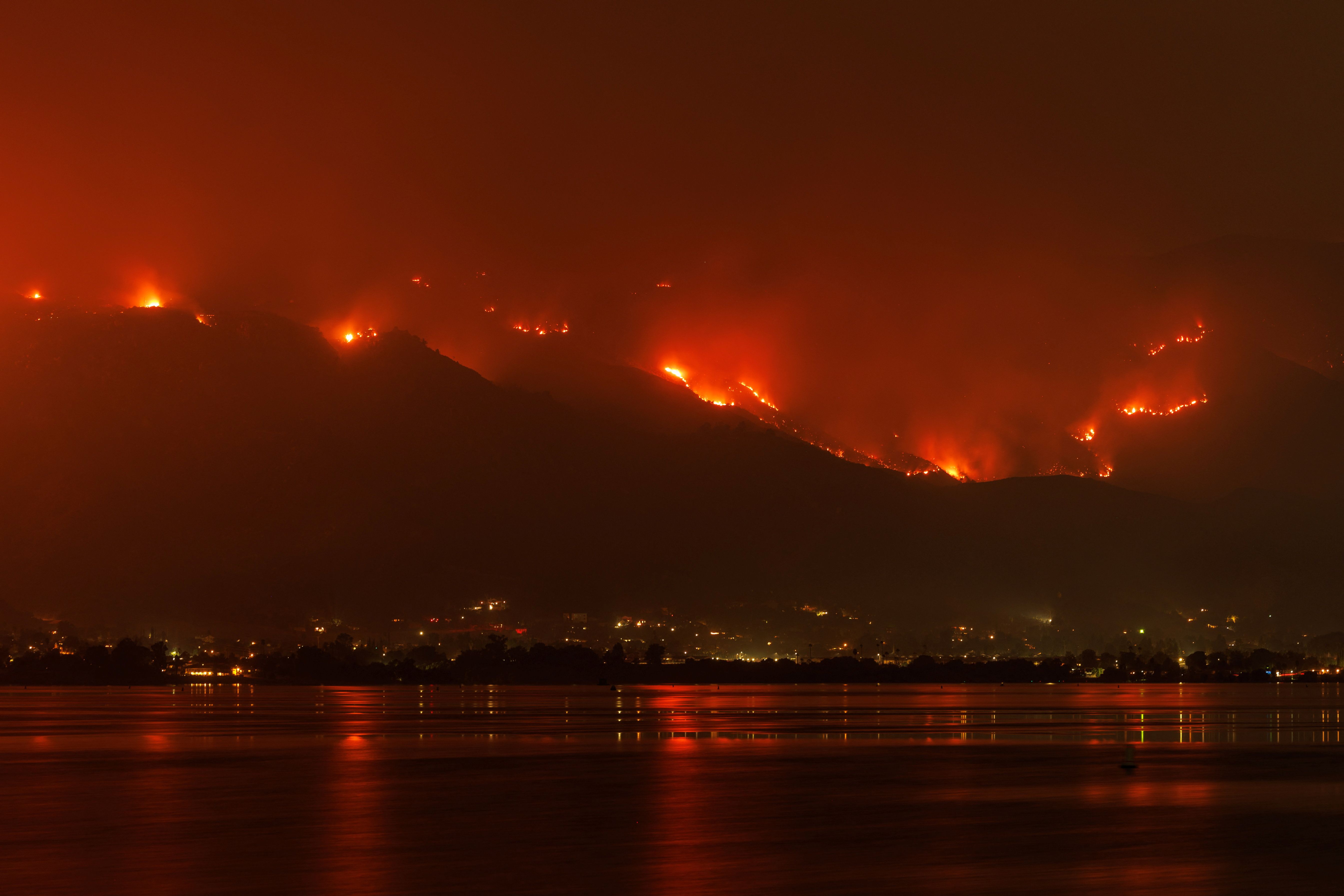 The Airport Fire burns along the hillside and is reflected in Lake Elsinore, California on September 10, 2024. (Photo by Mike Blake/Reuters)