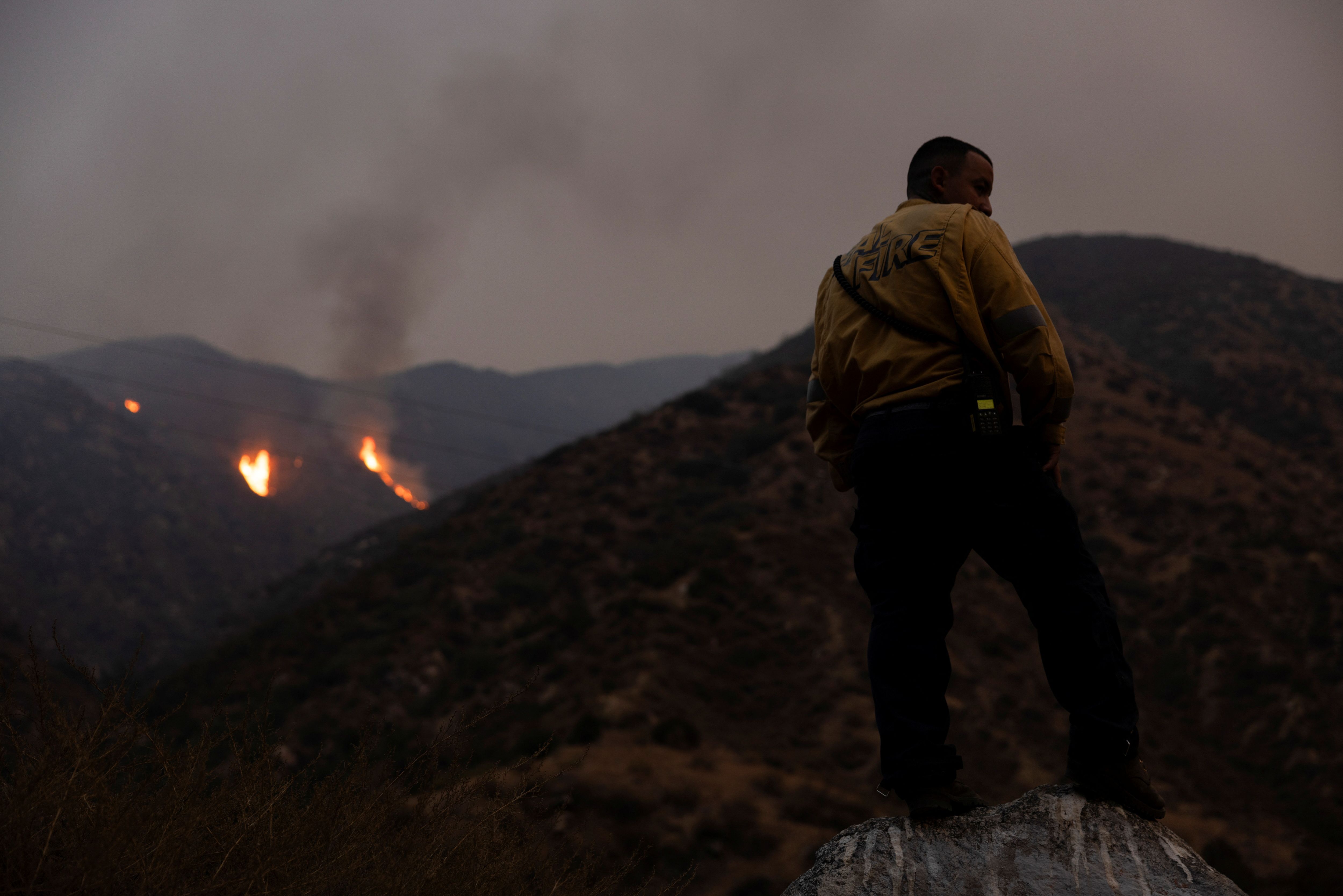 A firefighter monitors the progression of the Line Fire in the San Bernardino National Forest’s mountains over Highland, California on September 8, 2024. (Photo by Etienne Laurent/Reuters)