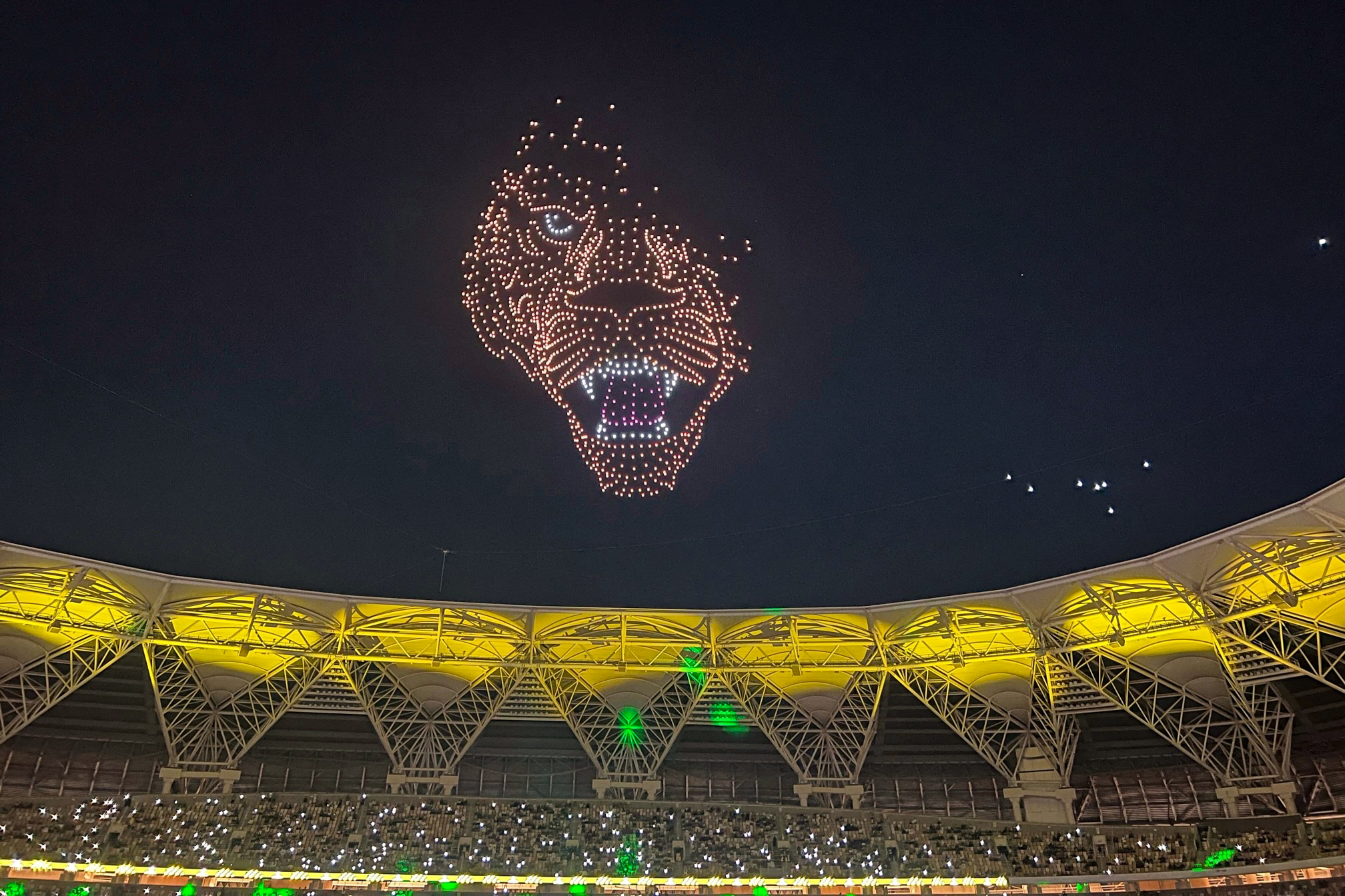 Fans watch fireworks at Al-Ittihad's stadium in Jeddah during a ceremony to unveil former Real Madrid striker Karim Benzema, on June 8, 2023. Benzema was unveiled as an Al-Ittihad player in front of thousands of fans in Saudi Arabia on June 8, a day after the oil-rich kingdom just failed to reel in Lionel Messi. (Photo by Haitham El-Tabei/AFP Photo)