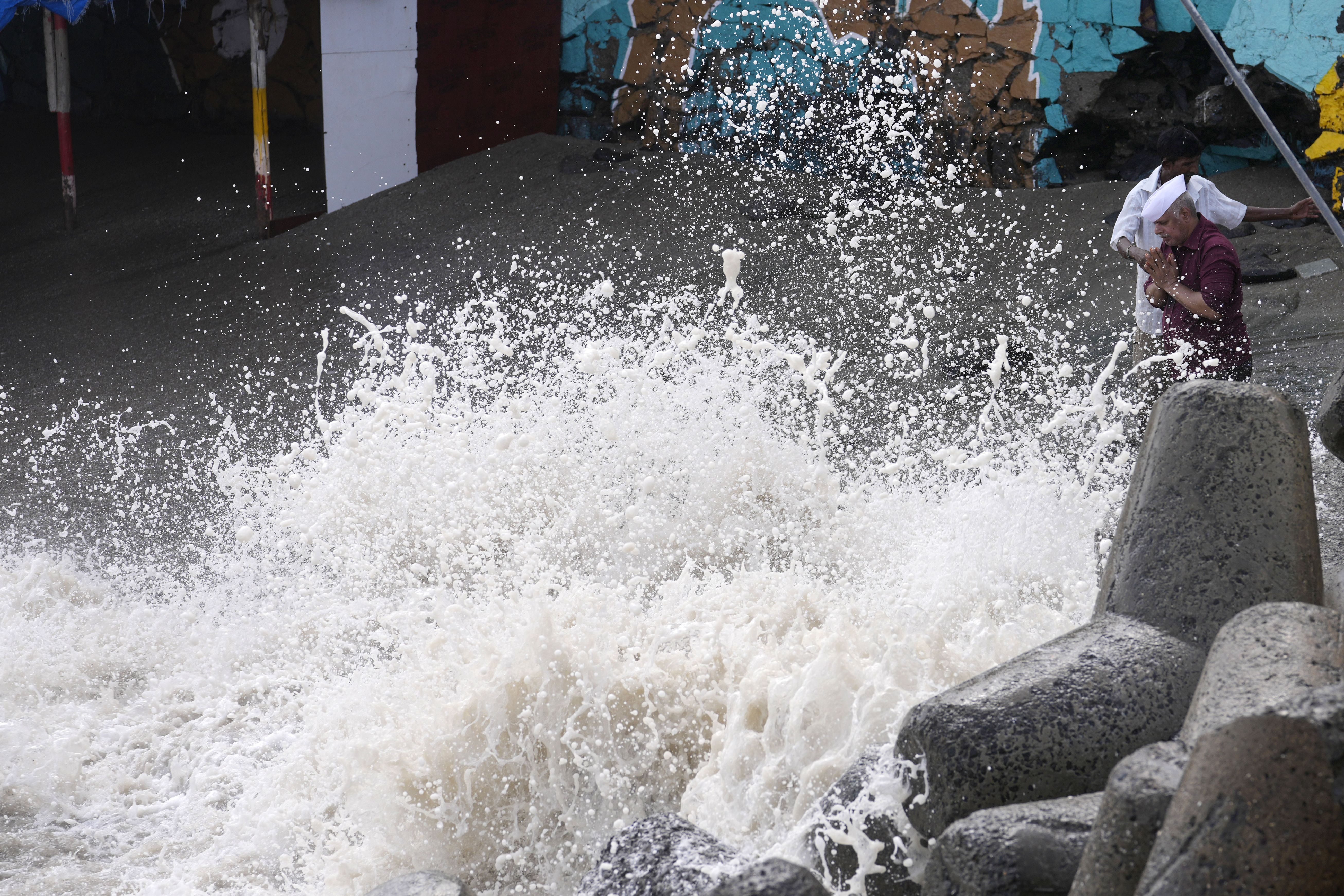 A man, right, performs rituals as waves hit the shore during high tide on the Arabian Sea coast in Mumbai, India, Wednesday, June 14, 2023. With Cyclone Biparjoy expected to make landfall Thursday evening, coastal regions of India and Pakistan are on high alert. (Photo by Rajanish Kakade/AP Photo)