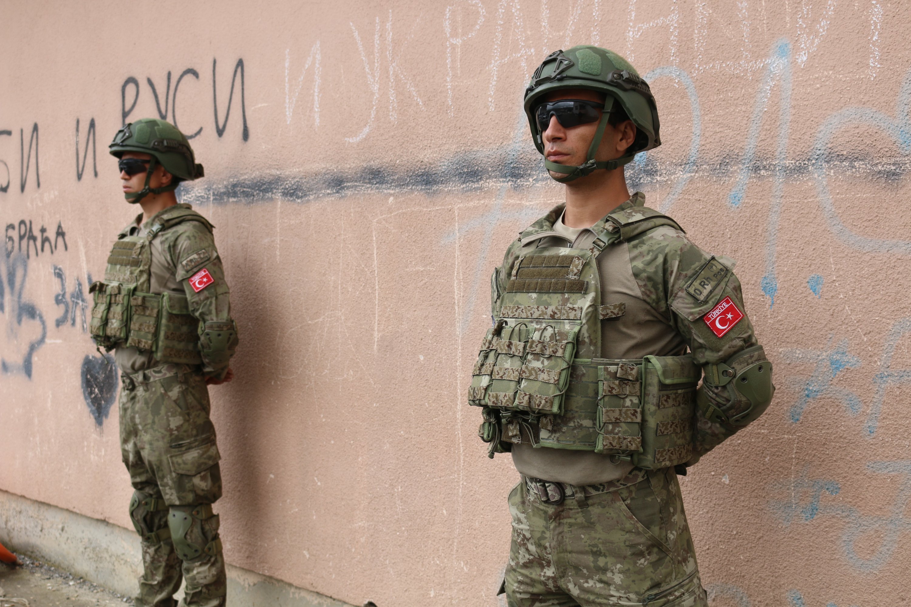 Turkish Army soldiers take security measures around Zubin Potok district in Northern Kosovo upon the request of NATO Kosovo Force (KFOR) in Mitrovica, Kosovo on June 15, 2023. (Photo by Erkin Keci/Anadolu Agency via Getty Images)