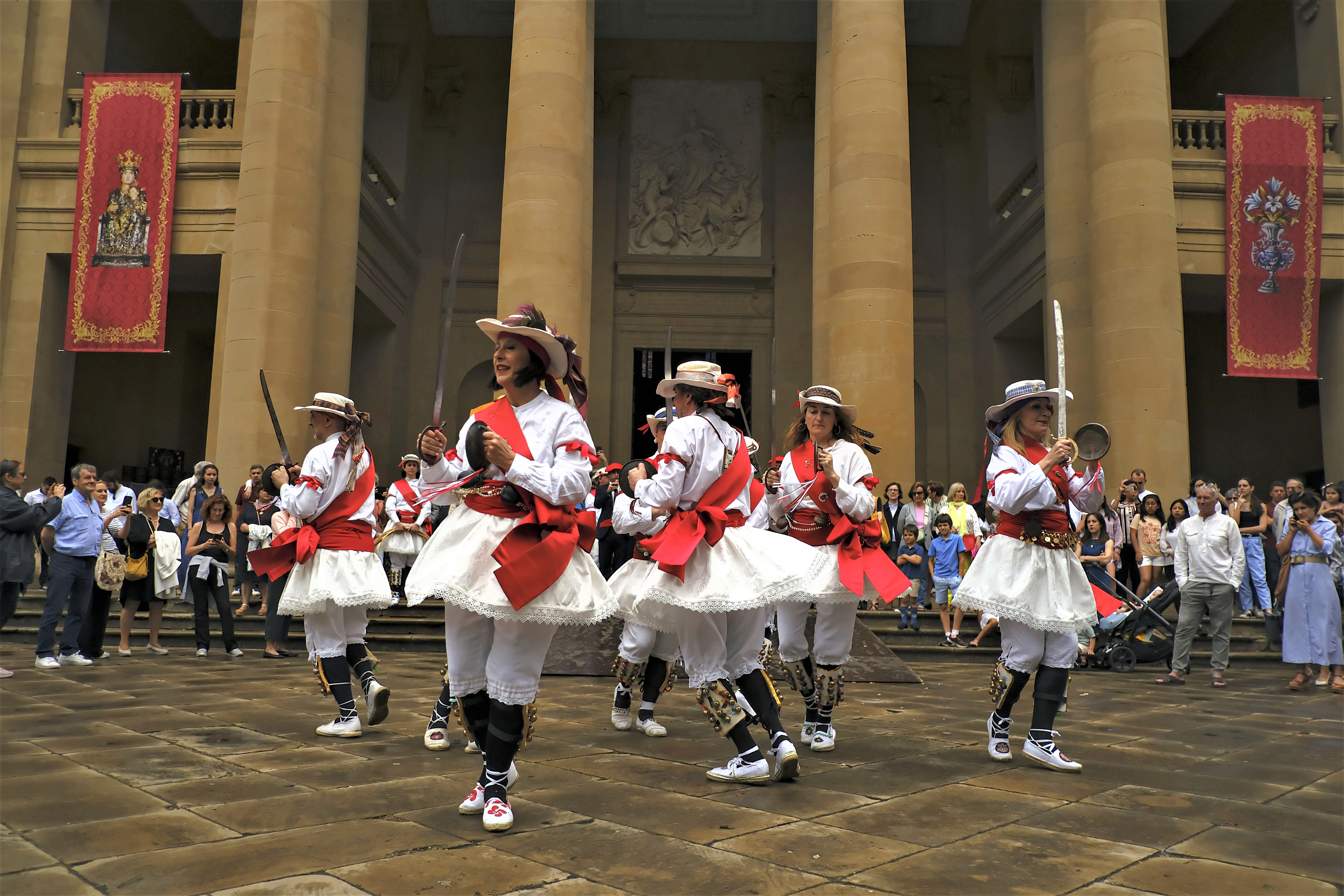 A group of dancers take part during the Corpus Christi procession, in Pamplona, northern Spain, Sunday, June 11, 2023. The day of Corpus Christi, an ancient Catholic tradition which takes place on June 8, has ceased to be a public holiday in Spain. (Photo by Alvaro Barrientos/AP Photo)