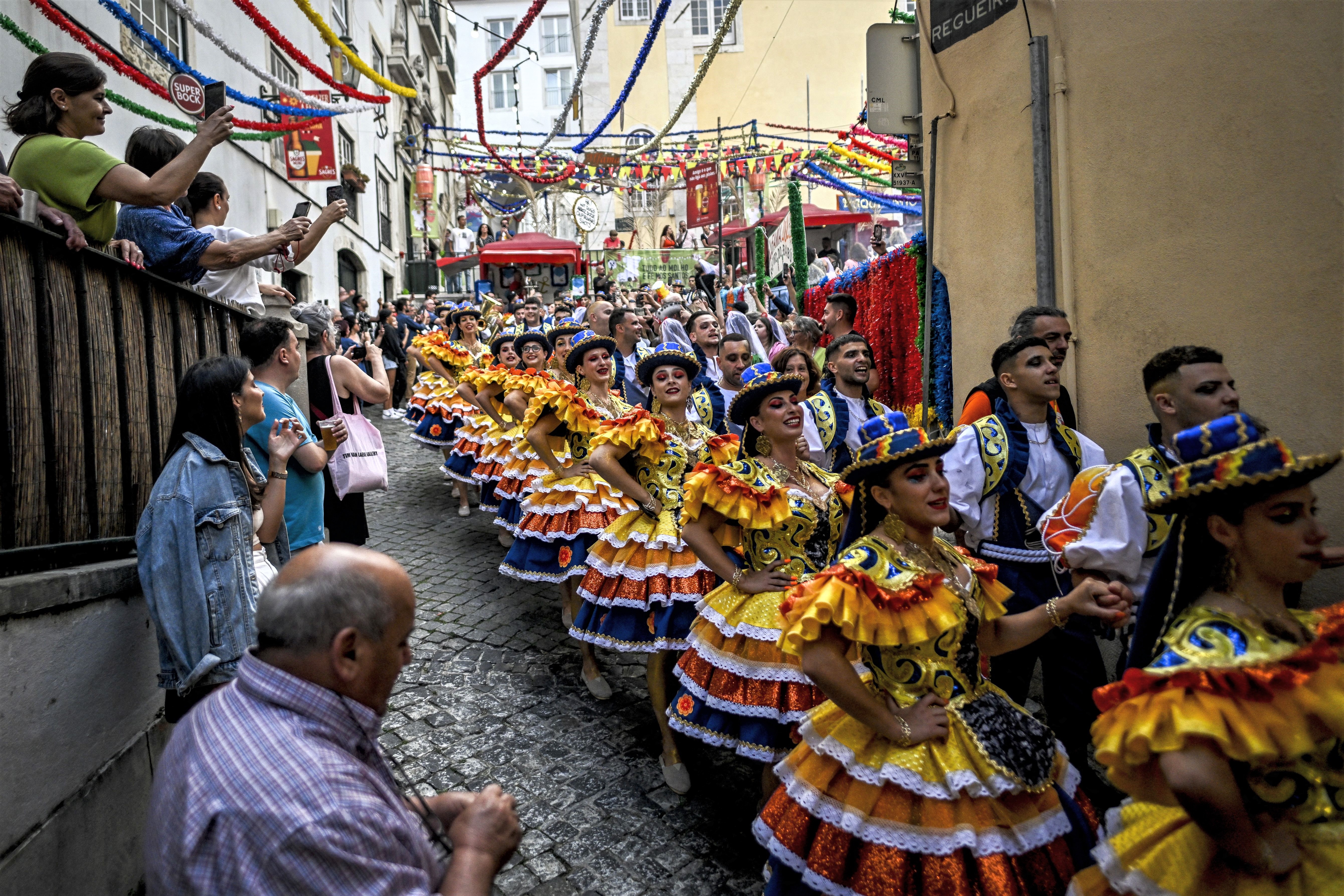 Revellers from the typical Lisbon neighbourhood, Alfama, parade in the streets before attending the Santo Antonio de Lisboa's Parade on Avenida da Liberdade, in Lisbon, on June 12, 2023. Lisbon celebrates Saint Anthony's day, the city's protector saint, with a parade that gathers participants from several typical neighbourhoods of the city. (Photo by Patrícia de Melo Moreira/AFP Photo)