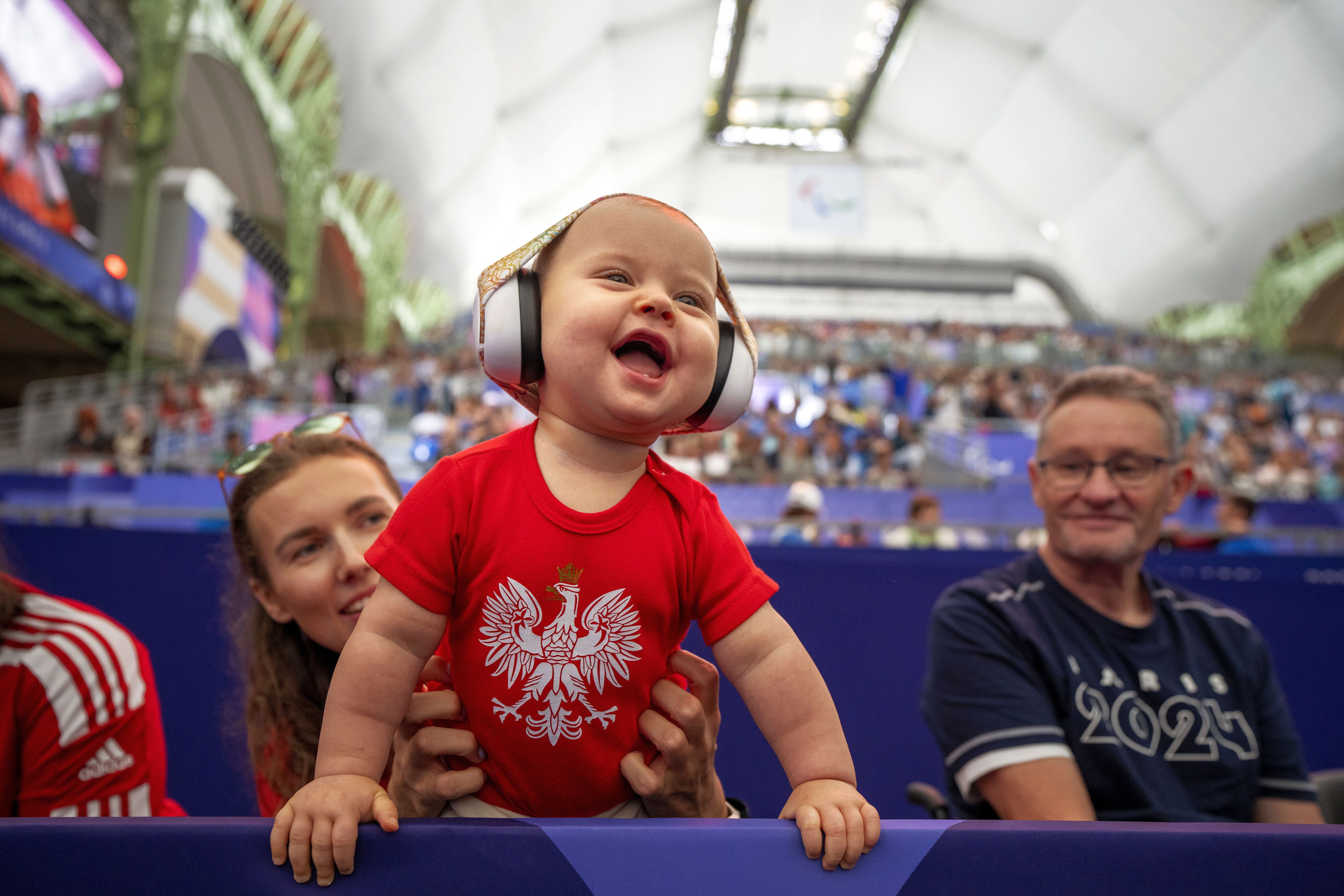Marcelina, 10 months old, for Poland, reacts watching a Wheelchair Fencing Women's Sabre Cat. A competition, at the 2024 Paralympics, Tuesday, September 3, 2024, in Paris, France. (Photo by Emilio Morenatti/AP Photo)
