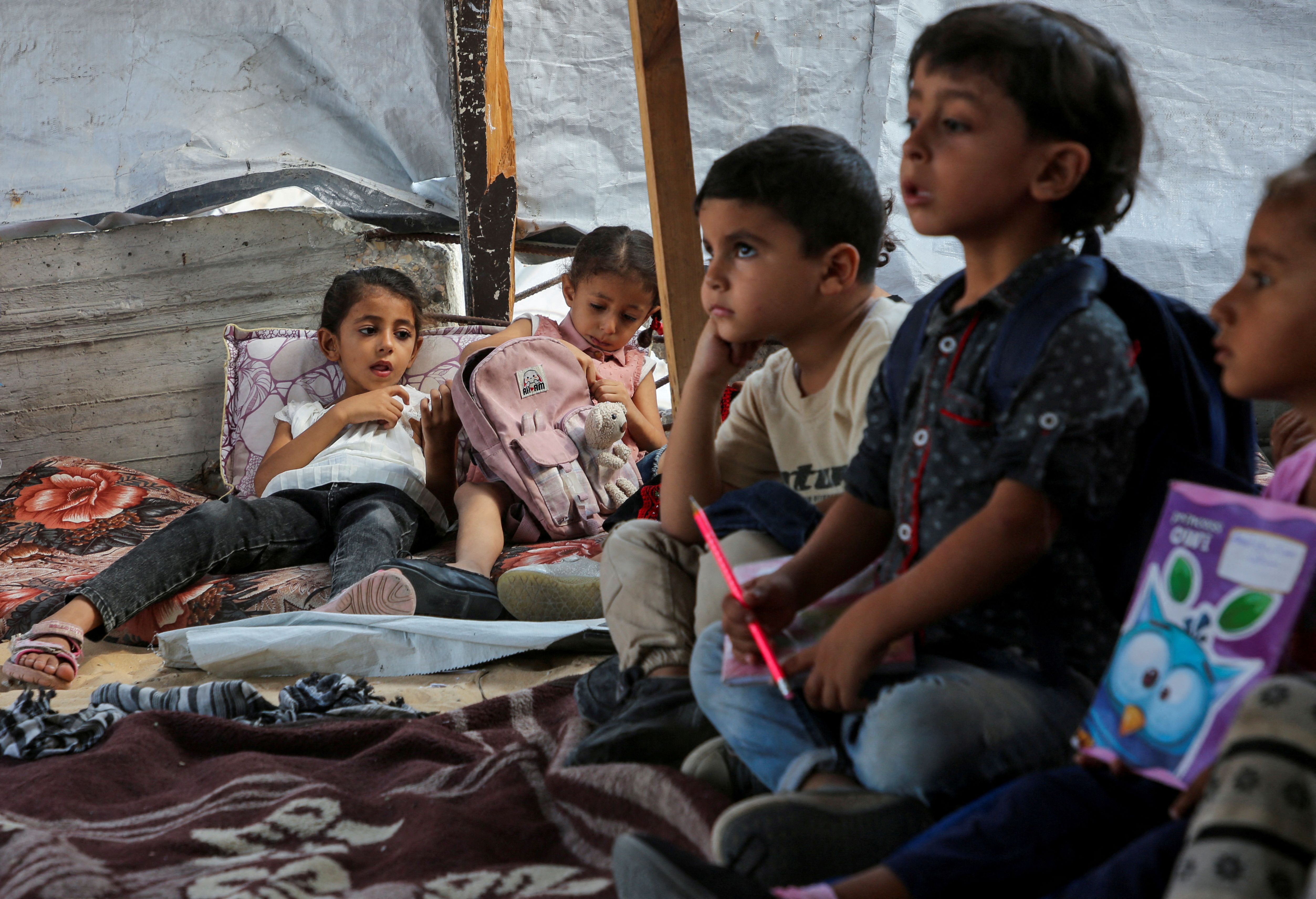 Palestinian students attend a class in a tent set up on the rubble of the house of teacher Israa Abu Mustafa, as war disrupts a new school year in Khan Younis, in the southern Gaza Strip on September 4, 2024. (Photo by Hatem Khaled/Reuters)