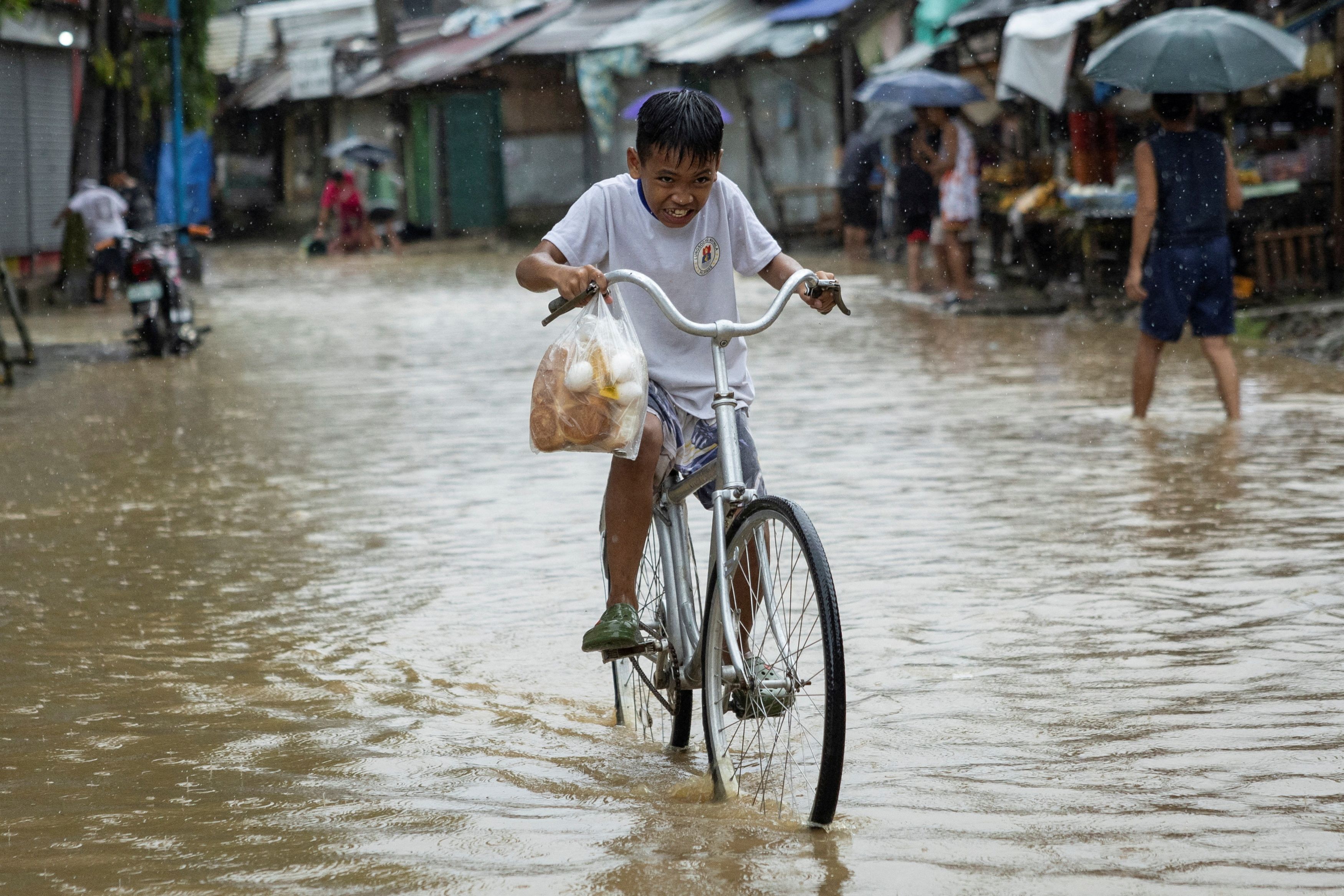 A boy carrying a plastic bag with bread and eggs, rides his bike through a flooded road after heavy rains brought by Tropical storm Yagi, locally known as Enteng, in Baras, Rizal province, Philippines, on September 2, 2024. (Photo by Eloisa Lopez/Reuters)