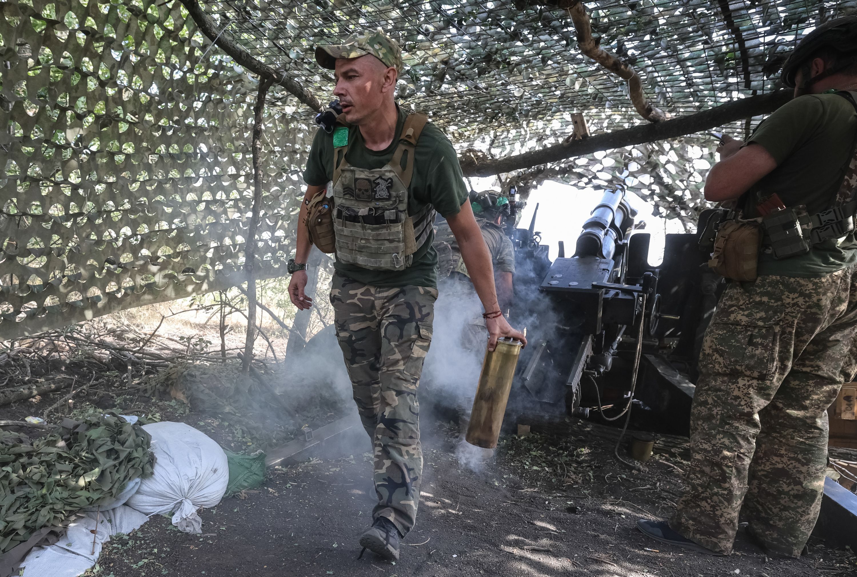 Dmytro, a member of the 15th Brigade of the Ukrainian National Guard, discards a spent shell casing after firing onto Russian positions near Pokrovsk on September 5, 2024. The city is a key logistical hub for the Ukrainian military. The Russian Defense Ministry reported on September 8 that its forces had captured the town of Novohrodivka, some 12 kilometers from Pokrovsk. (Photo by Serhiy Nuzhnenko/Radio Free Europe/Radio Liberty)