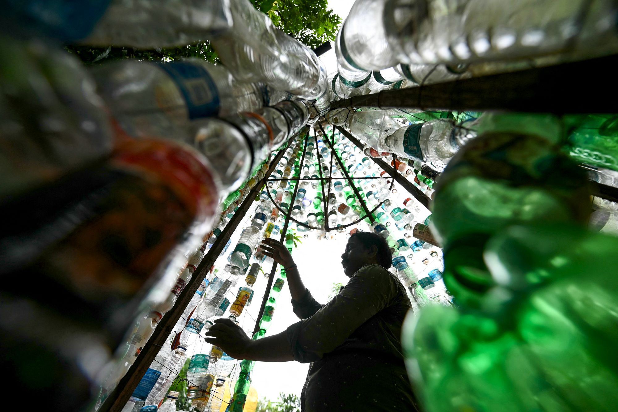 A man arranges used plastic bottles for an installation, in Chennai on September 6, 2024. (Photo by R.Satish Babu/AFP Photo)