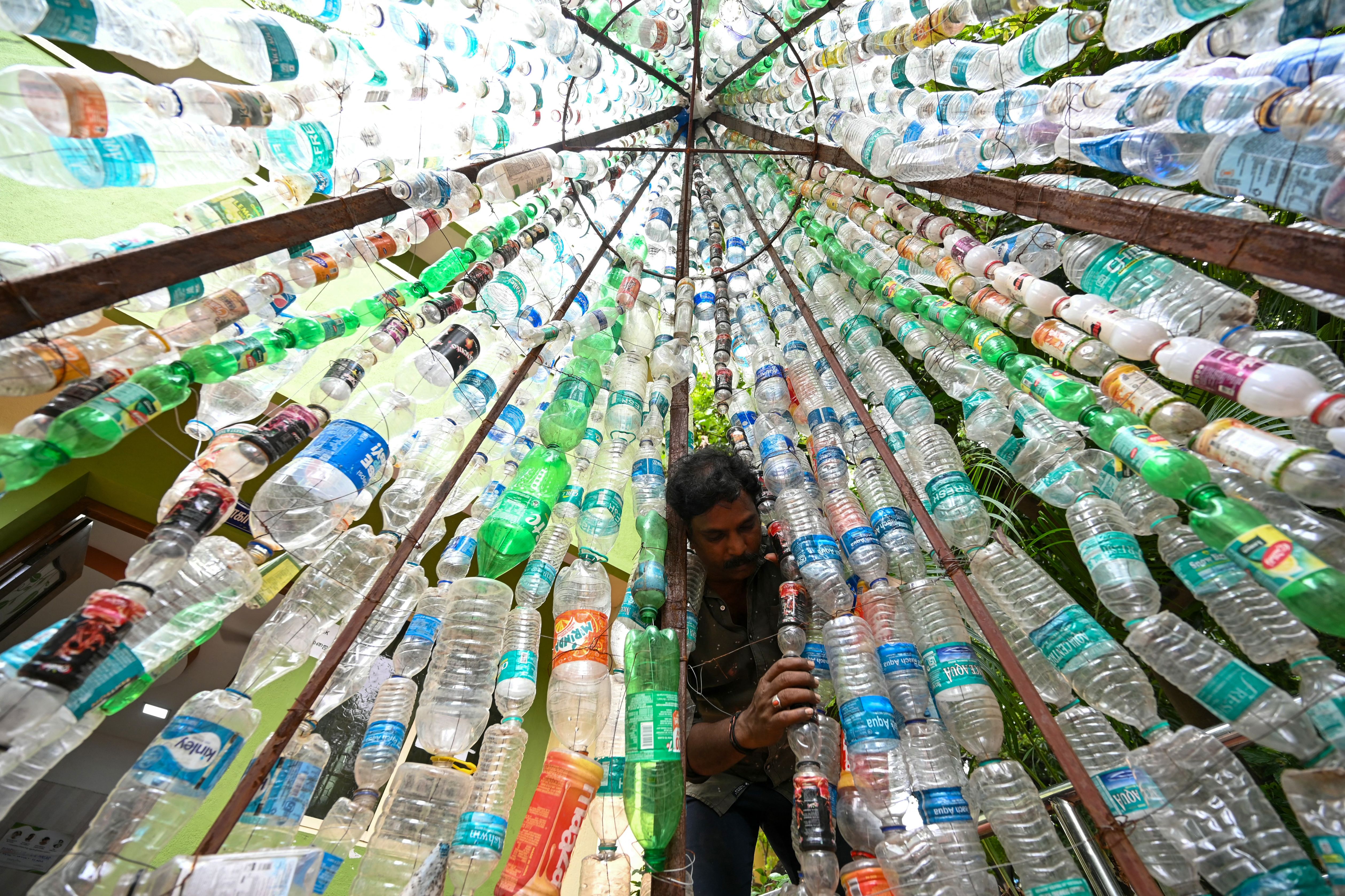 A man arranges used plastic bottles for an installation, in Chennai on September 6, 2024. (Photo by R.Satish Babu/AFP Photo)