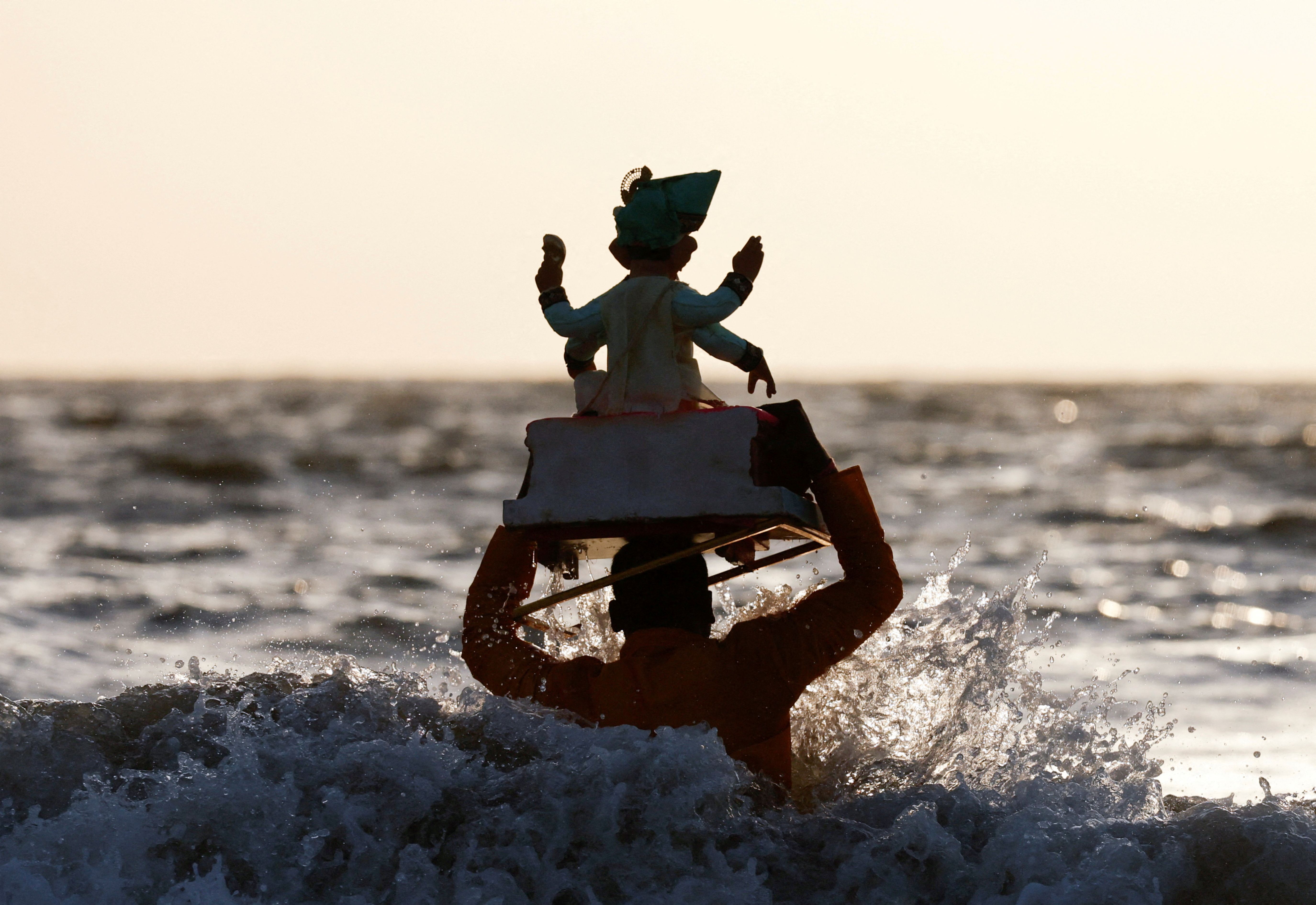 A man carries an idol of the Hindu God Ganesh, the deity of prosperity, for immersion off the coast of the Arabian Sea during the Ganesh Chaturthi festival in Mumbai, India on September 8, 2024. (Photo by Francis Mascarenhas/Reuters)