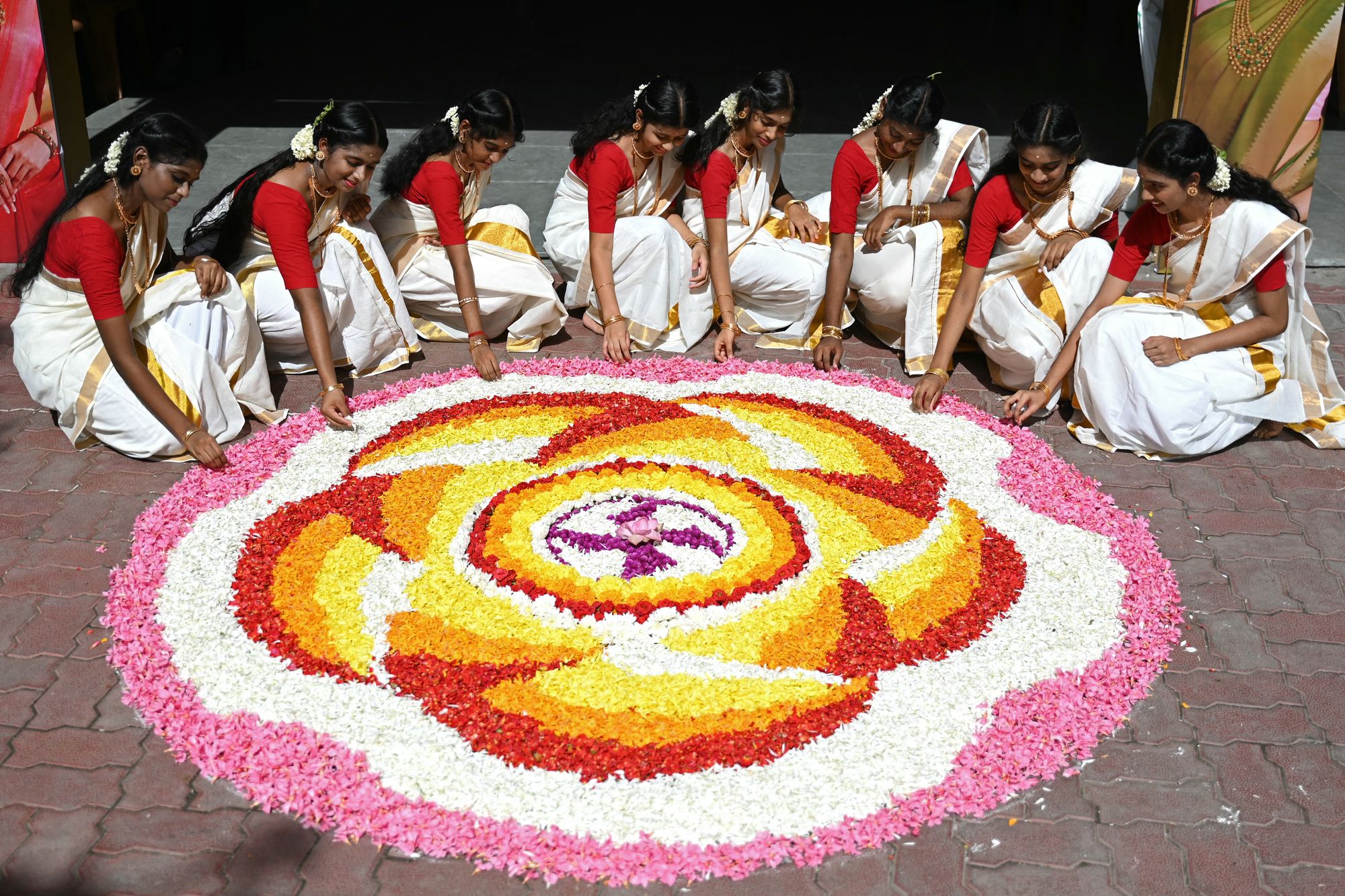 Students prepare a floral decorative design “Rangoli” during the celebrations to mark the annual harvest festival of “Onam” at a school, in Chennai on September 10, 2024. (Photo by R.Satish Babu/AFP Photo)