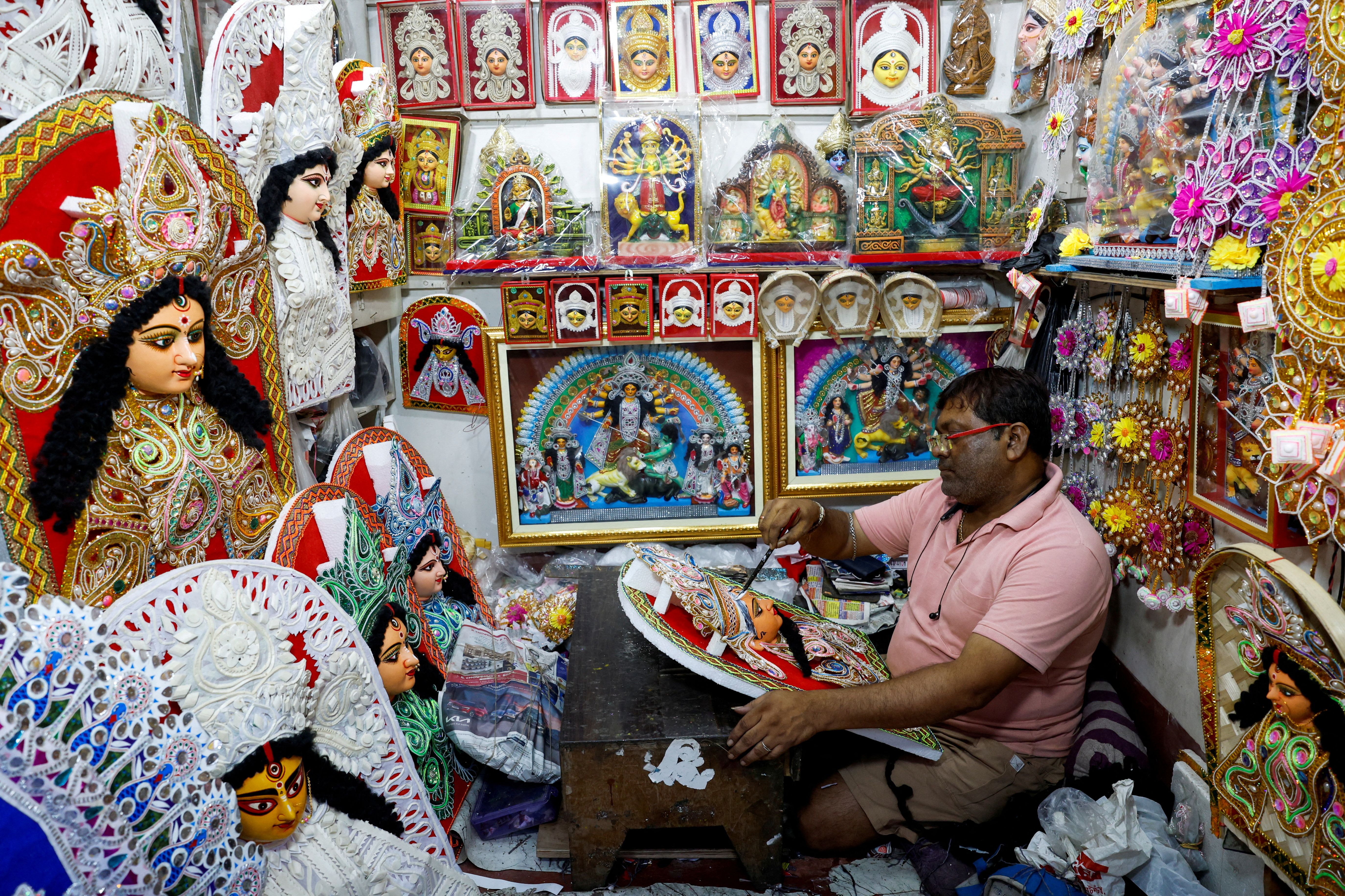 An artisan paints a decorative of the Hindu goddess Durga inside a shop ahead of the Durga Puja festival in Kolkata, India, on September 16, 2024. (Photo by Sahiba Chawdhary/Reuters)