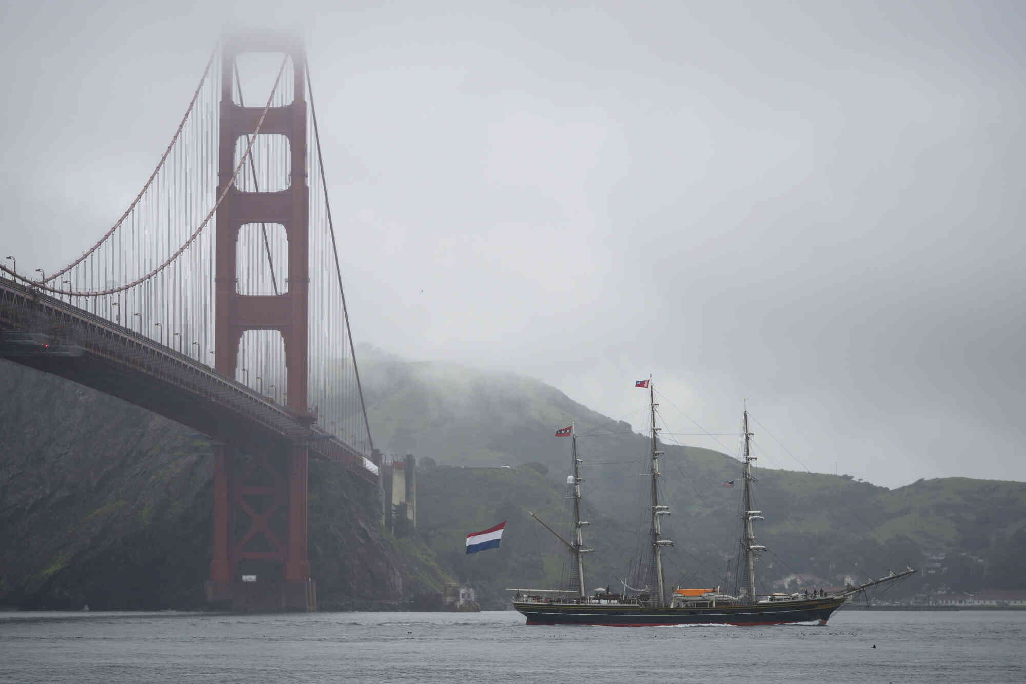 The Dutch tall ship Stad Amsterdam makes its way past the Golden Gate Bridge in San Francisco, Wednesday, March 6, 2024. The ship is visiting San Francisco and will be docked at Pier 30-32 until March 24 before continuing on its world tour. (Photo by Eric Risberg/AP Photo)