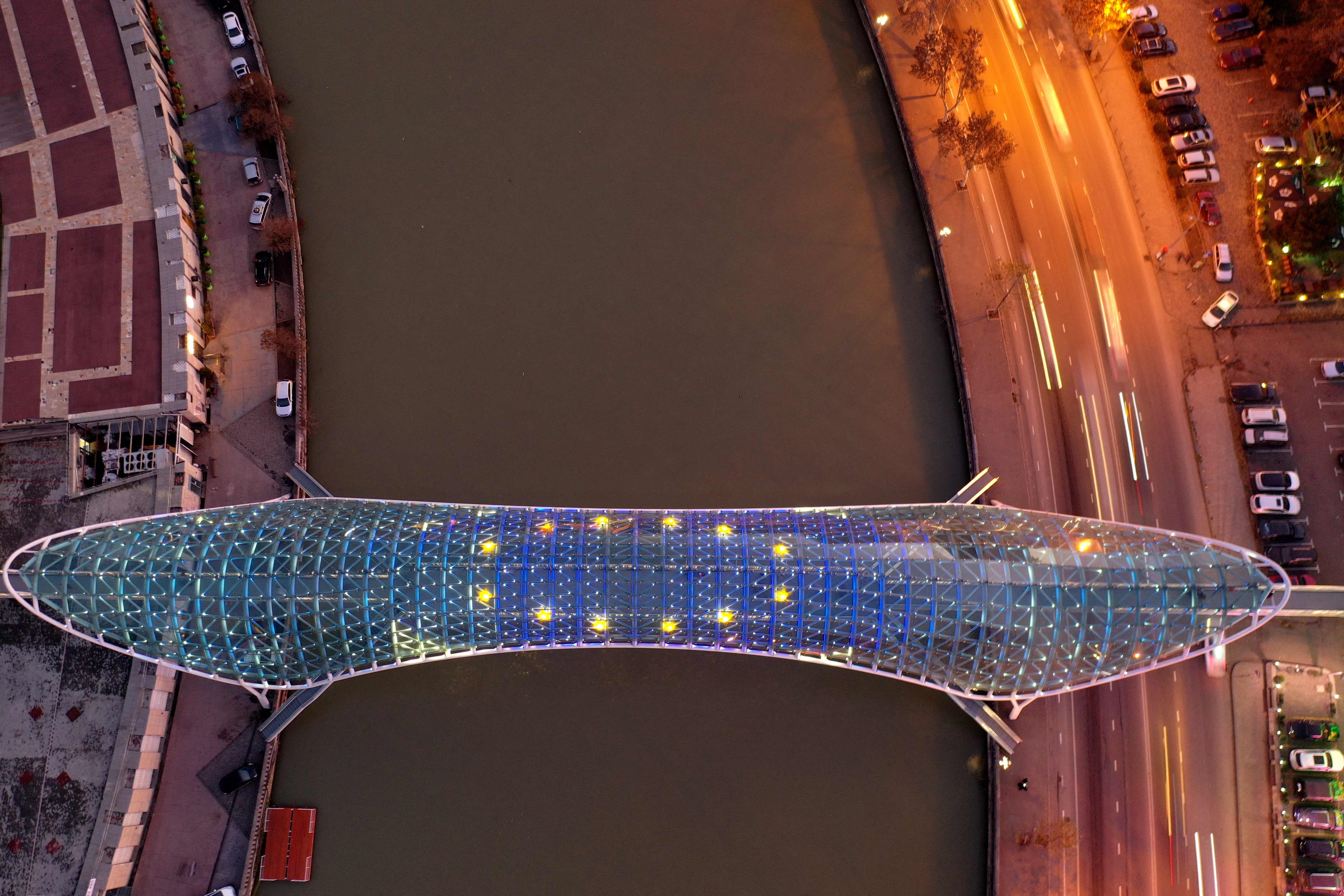 This aerial view taken in Tbilisi on December 16, 2023 shows the Bridge of Peace illuminated with EU flag to mark the Georgia's European Union candidate status. (Photo by Vano Shlamov/AFP Photo)