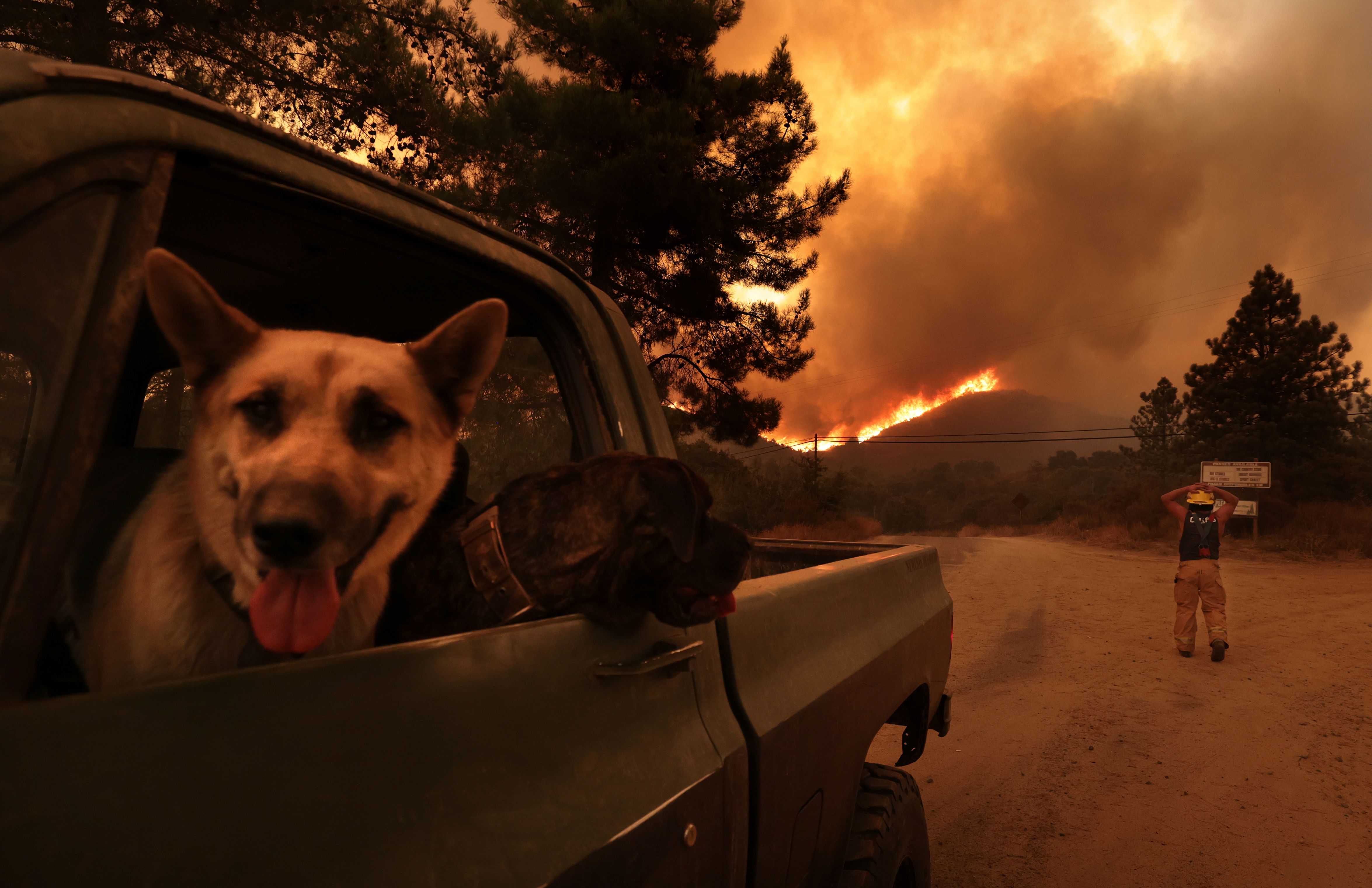 Orange County, California September 10, 2024. A resident stops to watch the Airport Fire burn near his home as he evacuates his dogs in the Santa Ana Mountains Tuesday. (Photo by Wally Skalij/Los Angeles Times via Getty Images)