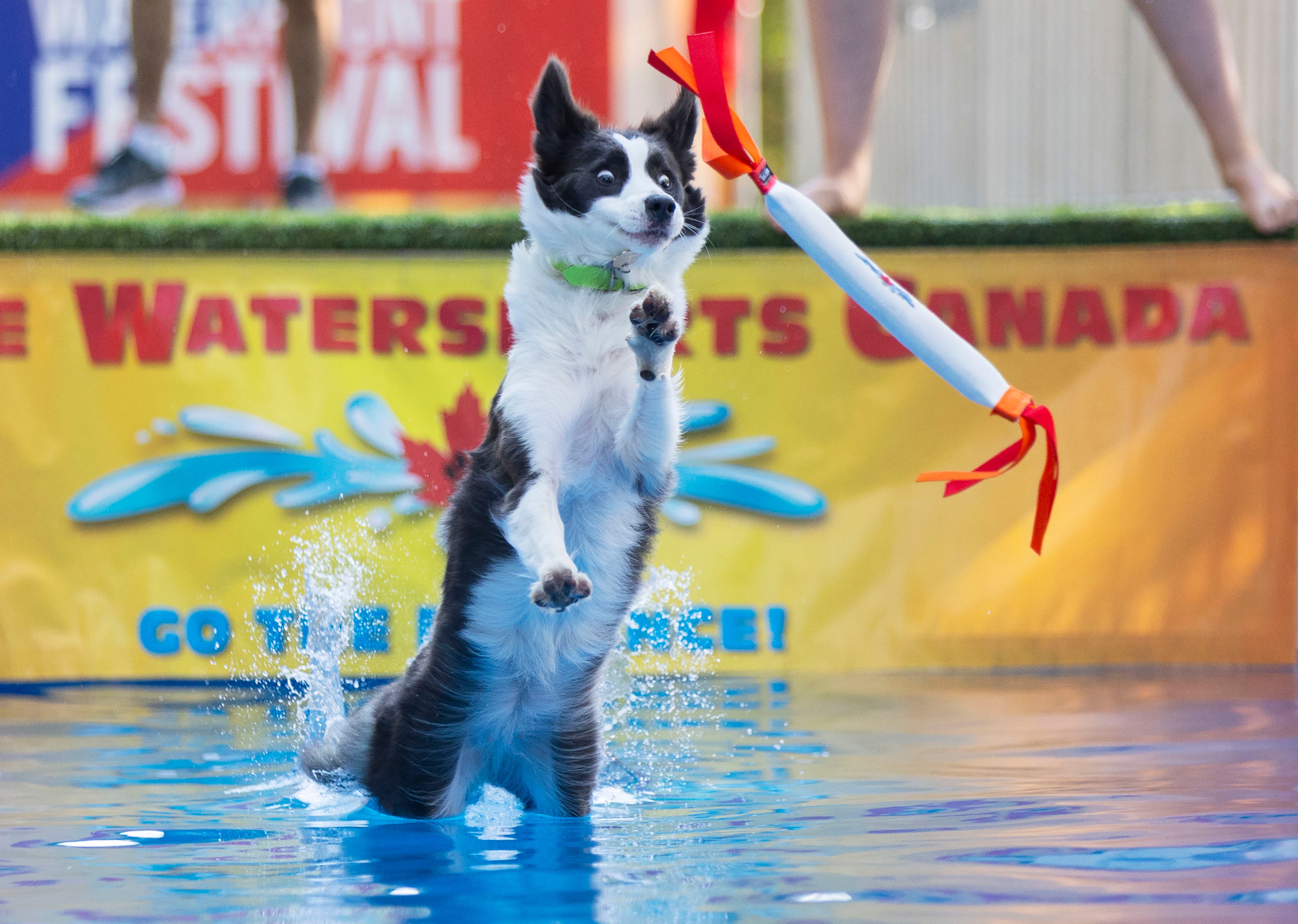A pet dog jumps into a pool to catch a tossed toy during a dock diving event at the 2024 Waterfront Festival in Toronto, Canada, September 15, 2024. Dock diving is a sport where agile dogs compete for prizes by jumping for distance from a dock into a pool of water. (Photo by Xinhua News Agency/Rex Features/Shutterstock)
