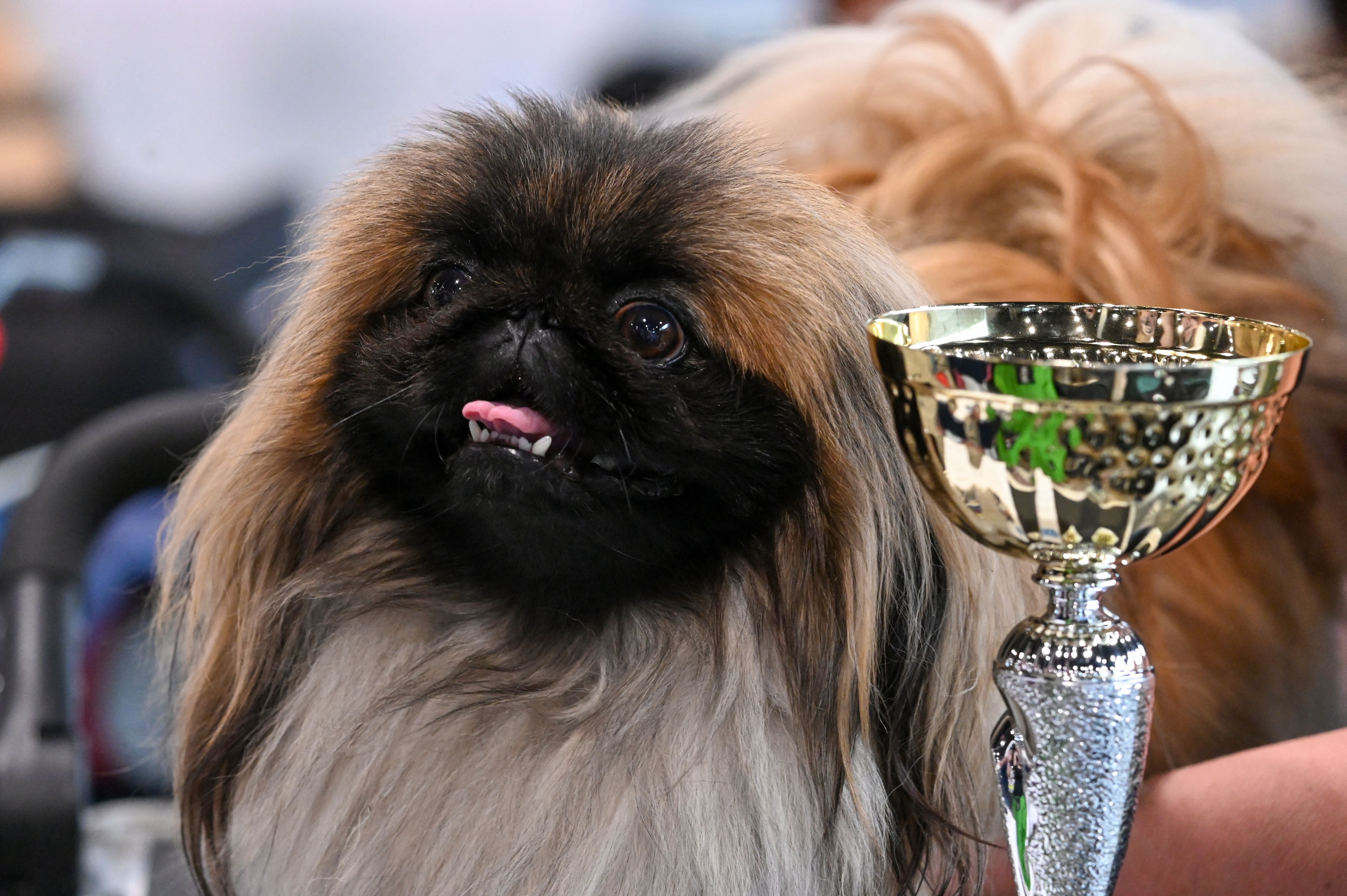 Picture taken on June 4, 2023 shows a Pekingese dog breed champion posing next to its trophy at the “Hungexpo”, the International Exhibition and Fair territory of Budapest, Hungary, during the President Cup CACIB and CAC Dog Show international dog exhibition. (Photo by Attila Kisbenedek/AFP Photo)