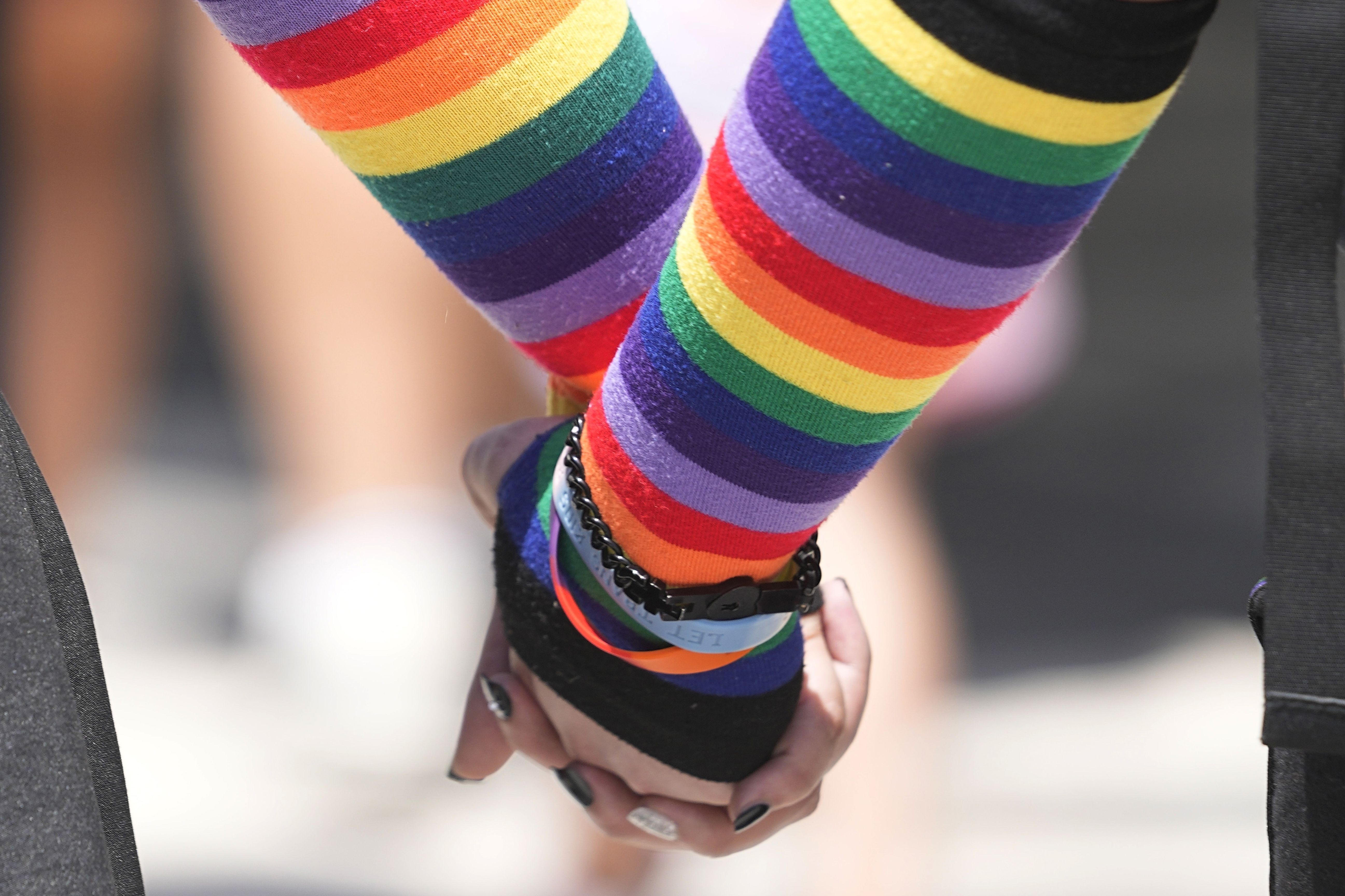A couple hold hands at they leave the Pride Parade, Saturday, June 10, 2023, in Indianapolis. (Photo by Darron Cummings/AP Photo)