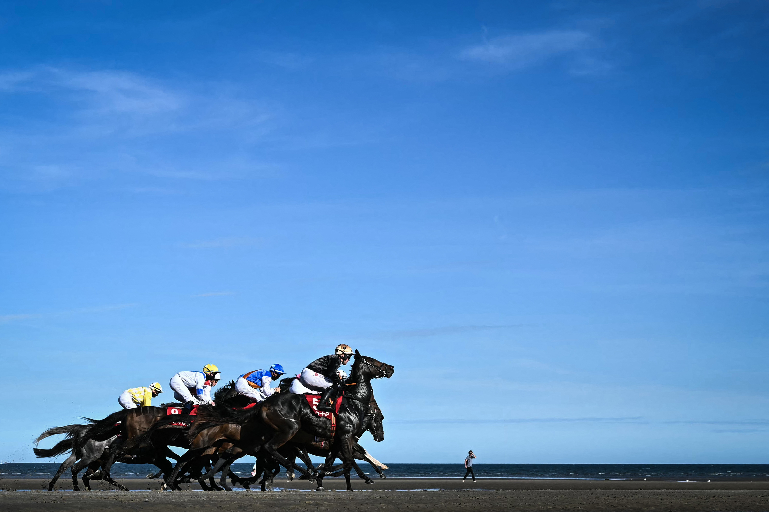 Horses compete on the first race over the sand, on the course on Laytown beach, in County Meath on the east coast of Ireland, on September 16, 2024, during The Laytown Races. (Photo by Paul Ellis/AFP Photo)
