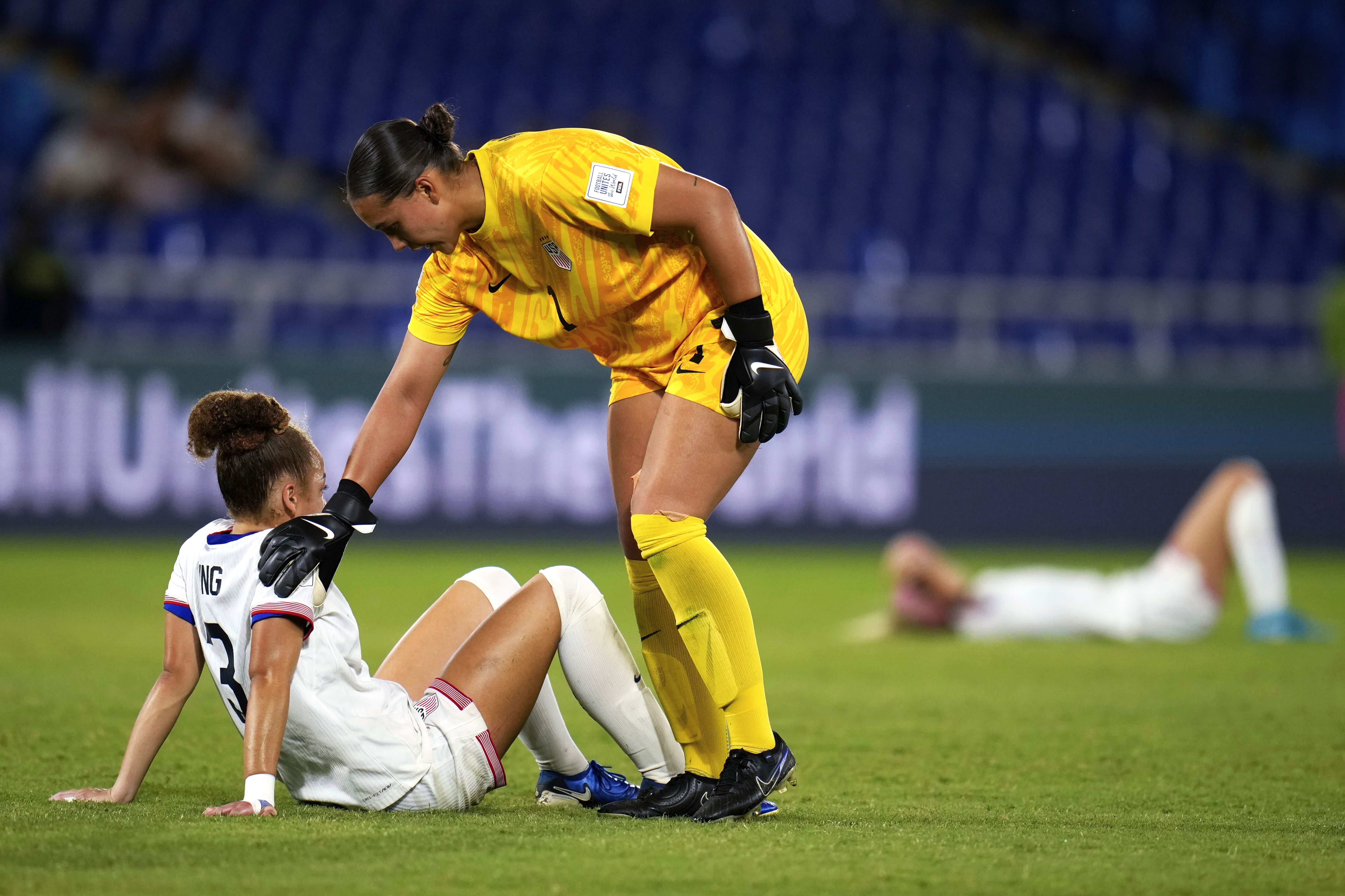 Goalkeeper Teagan Wy, of the United States, comforts Savannah King after they lost to North Korea in a U-20 Women's World Cup semifinal soccer match in Cali, Colombia, Wednesday, September 18, 2024. (Photo by Fernando Vergara/AP Photo)