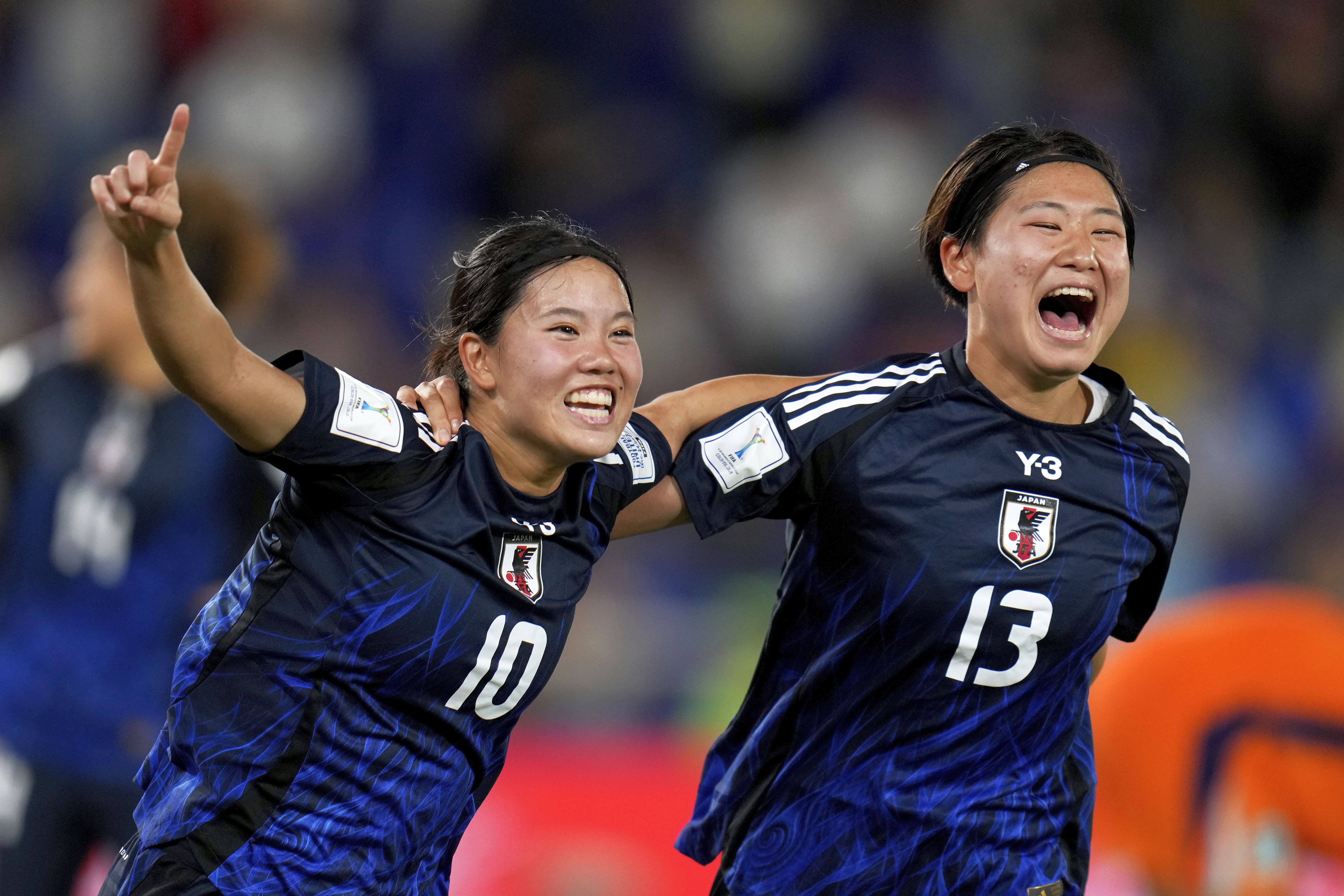 Japan's Tanaka Matsucubo, left, celebrates with teammate Maya Hijikata scoring her side's opening goal against Netherlands during a U-20 Women's World Cup semifinal soccer match in Cali, Colombia, Wednesday, September 18, 2024. (Photo by Fernando Vergara/AP Photo)