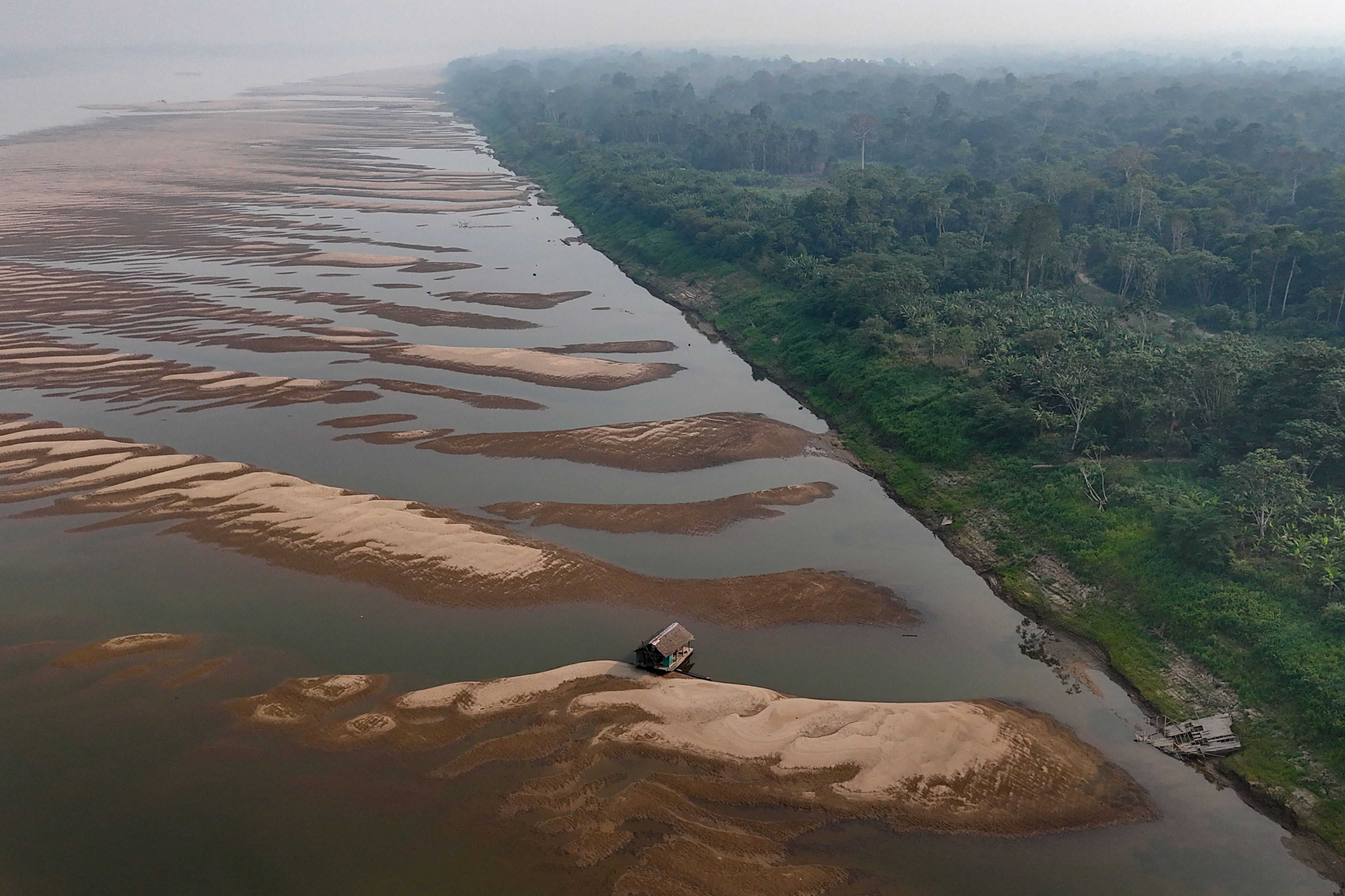 Aerial view of sandbanks on the Madeira River, in front of the city of Humaitá, Amazonas state, northern Brazil, taken on September 4, 2024. The 2024 northern summer saw the highest global temperatures on record, beating 2023's high and making this year likely Earth's hottest ever recorded, the EU's climate monitor said on September 6, 2024. The data from the Copernicus Climate Change Service followed a season of heatwaves around the world that scientists said were intensified by human-driven climate change. (Photo by Michael Dantas/AFP Photo)