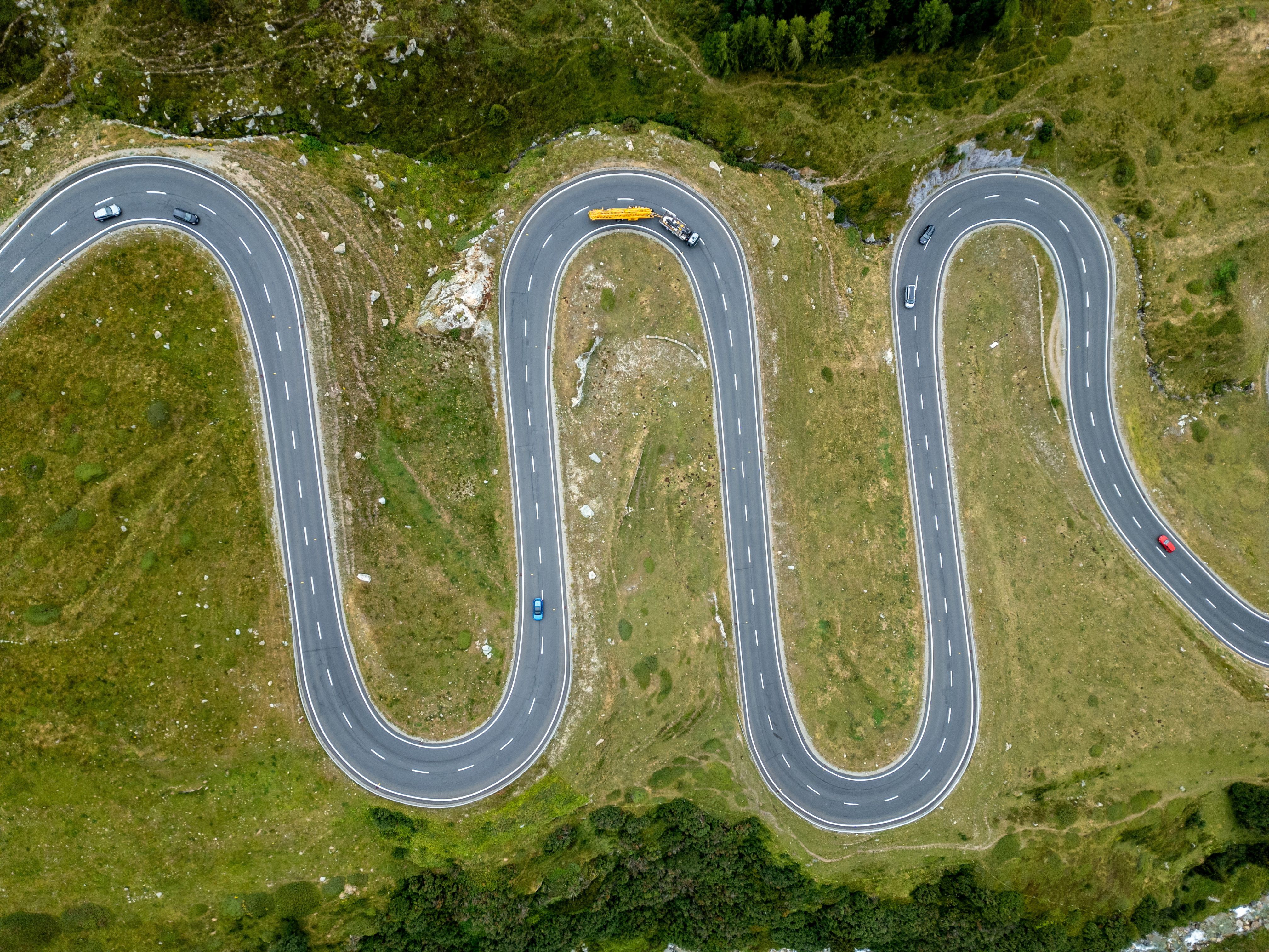 A drone view shows traffic in the curves of the Julierpass road in Surses near Saint-Moritz, Switzerland on September 4, 2024. (Photo by Denis Balibouse/Reuters)