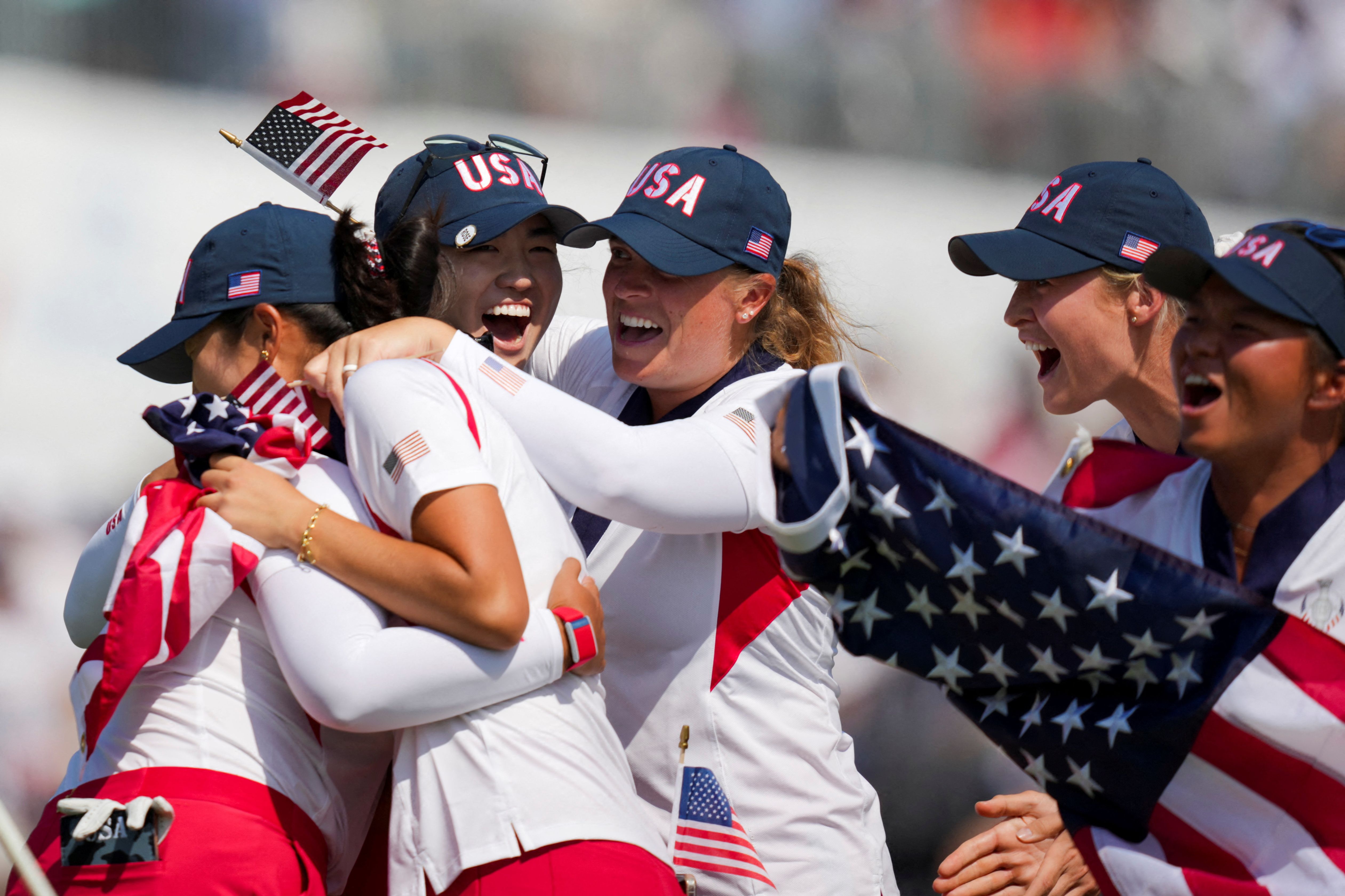 Team USA celebrates on the 18th green after winning the Solheim Cup against Team Europe at Robert Trent Jones Golf Club on September 15, 2024. (Photo by Aaron Doster/Imagn Images/Reuters)