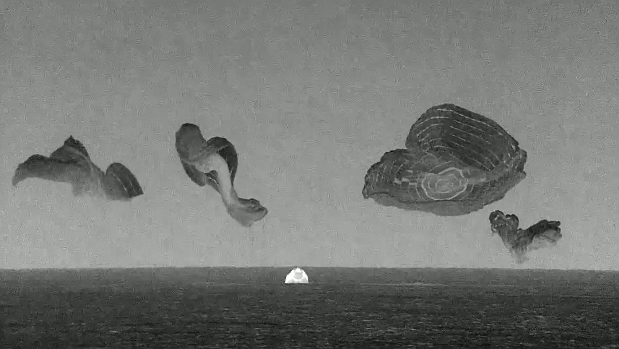 This still image taken from a SpaceX and Polaris broadcast on September 15, 2024, shows the manned Polaris Dawn mission's “Dragon” capsule splashing down off the coast of Dry Tortugas, Florida, completing the first human spaceflight mission by non-government astronauts of the Polaris Program. The SpaceX Polaris Dawn mission, which made history when its crew conducted the first spacewalk by non-government astronauts, splashed down off the coast of Florida early on September 15, 2024. The Dragon spacecraft landed in the ocean at 3:37 am (0737 GMT), a webcast of the splashdown showed, with a recovery team deploying in the pre-dawn darkness to retrieve the capsule and crew. The capsule was lifted from the water and onto the recovery vessel half a hour later. (Photo by Polaris Program/AFP Photo)