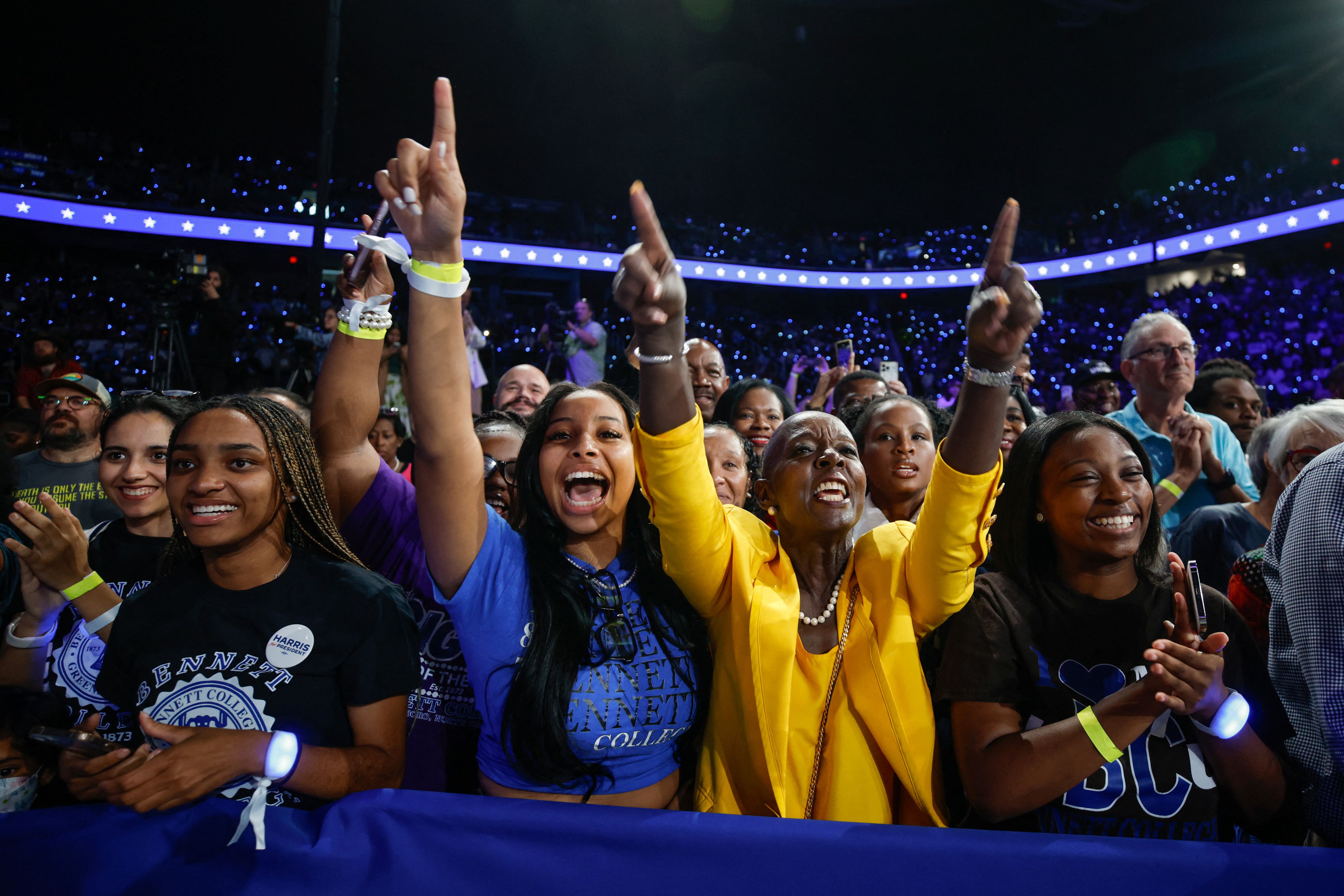 Supporters of Democratic presidential nominee and U.S. Vice President Kamala Harris react during a campaign rally in Greensboro, North Carolina, U.S., September 12, 2024. (Photo by Jonathan Drake/Reuters)