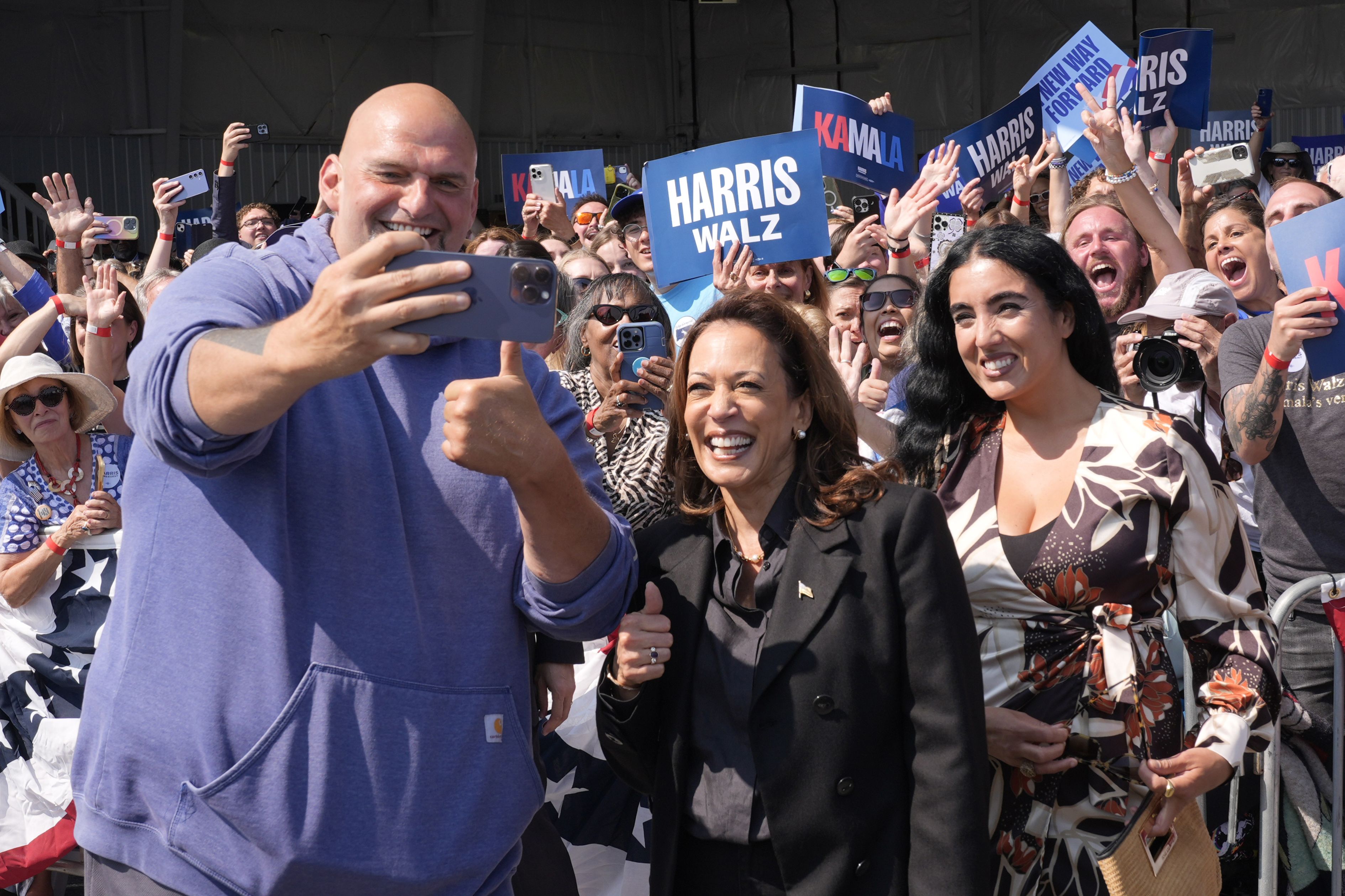 Democratic presidential nominee Vice President Kamala Harris takes a selfie with Sen. John Letterman, D-Pa., and his wife Gisele Barreto Fetterman, after Harris arrived at John Murtha Johnstown-Cambria Airport, in Johnstown, Pa., for a campaign event, Friday, September 13, 2024. (Photo by Jacquelyn Martin/AP Photo)