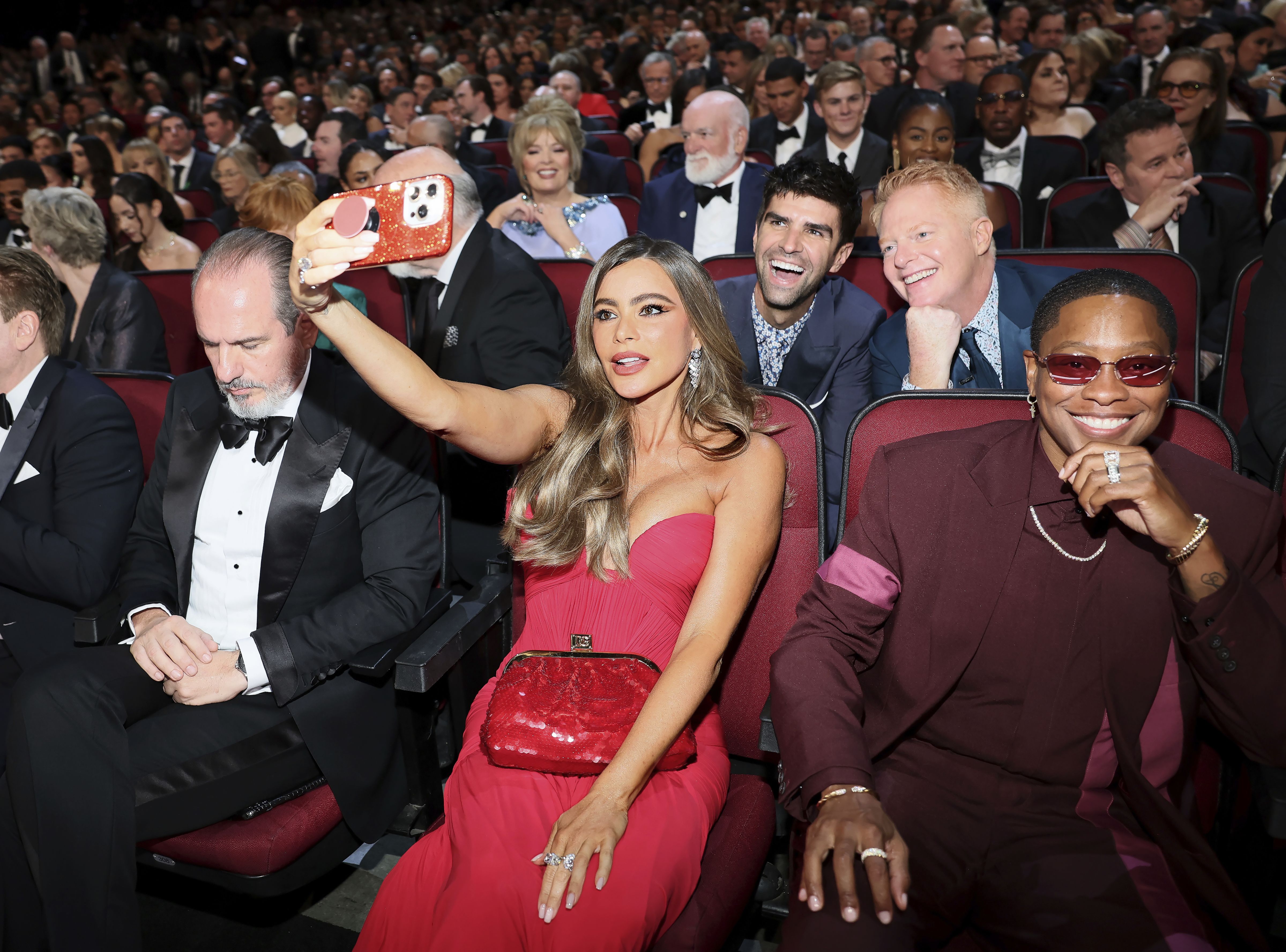 Sofía Vergara, Justin Mikita, Jesse Tyler Ferguson and Jessica Betts at the 76th Emmy Awards on Sunday, September 15, 2024 at the Peacock Theater in Los Angeles. (Photo by Danny Moloshok/Invision for the Television Academy/AP Content Services)