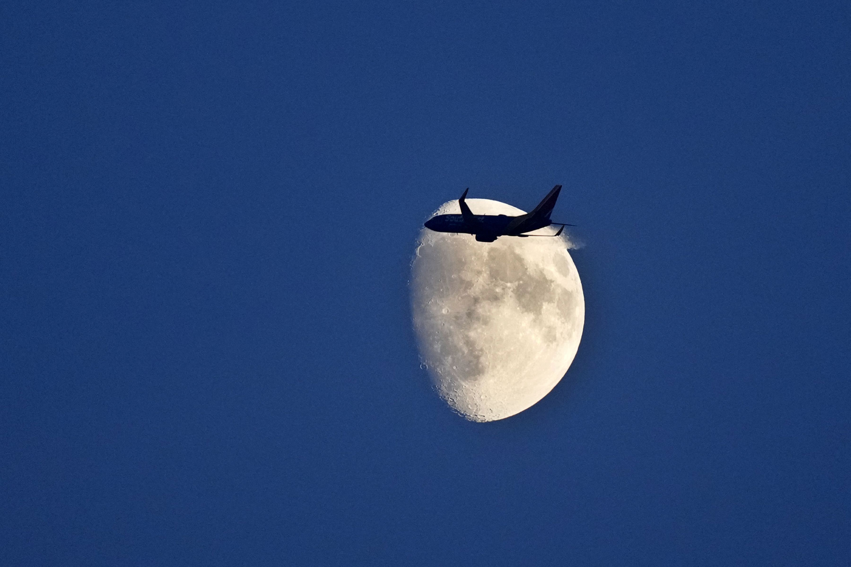 A Southwest Airlines plane is seen from inside Guaranteed Rate Field during the third inning of a baseball game between the Chicago White Sox and the Oakland Athletics, passes a waxing gibbous moon as it heads East, after taking off from Midway International Airport on Friday, September 13, 2024, in Chicago. (Photo by Charles Rex Arbogast/AP Photo)