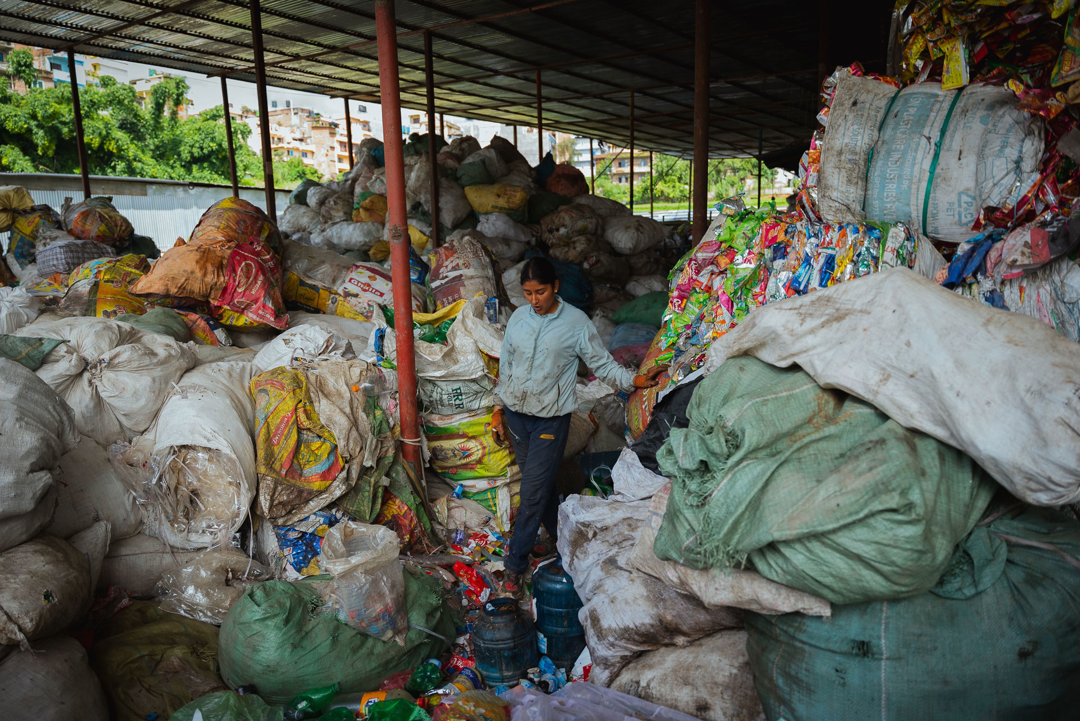 A worker pauses for a moment from sorting through recyclable goods at the Avni recycling plant on August 18, 2024 in Kathmandu, Nepal. Avni Ventures is a green social business based in Kathmandu that is pioneering the circular economy in Nepal through PET collection and recycling, green technology R&D, sustainability education, and consultancy services. As the largest responsible plastic waste collection and recycling network in Nepal, Avni has created a formal supply chain, supported waste entrepreneurs, and partnered with local governments to reduce CO2 emissions and eliminate child labor in the waste sector. The company is also the official recycling partner of the Mountain Clean Up Campaign, led and coordinated by the Nepali Army, in charge of sorting and processing the recyclable waste collected from Mount Everest, the world's tallest mountain. (Photo by Mailee Osten-Tan/Getty Images)