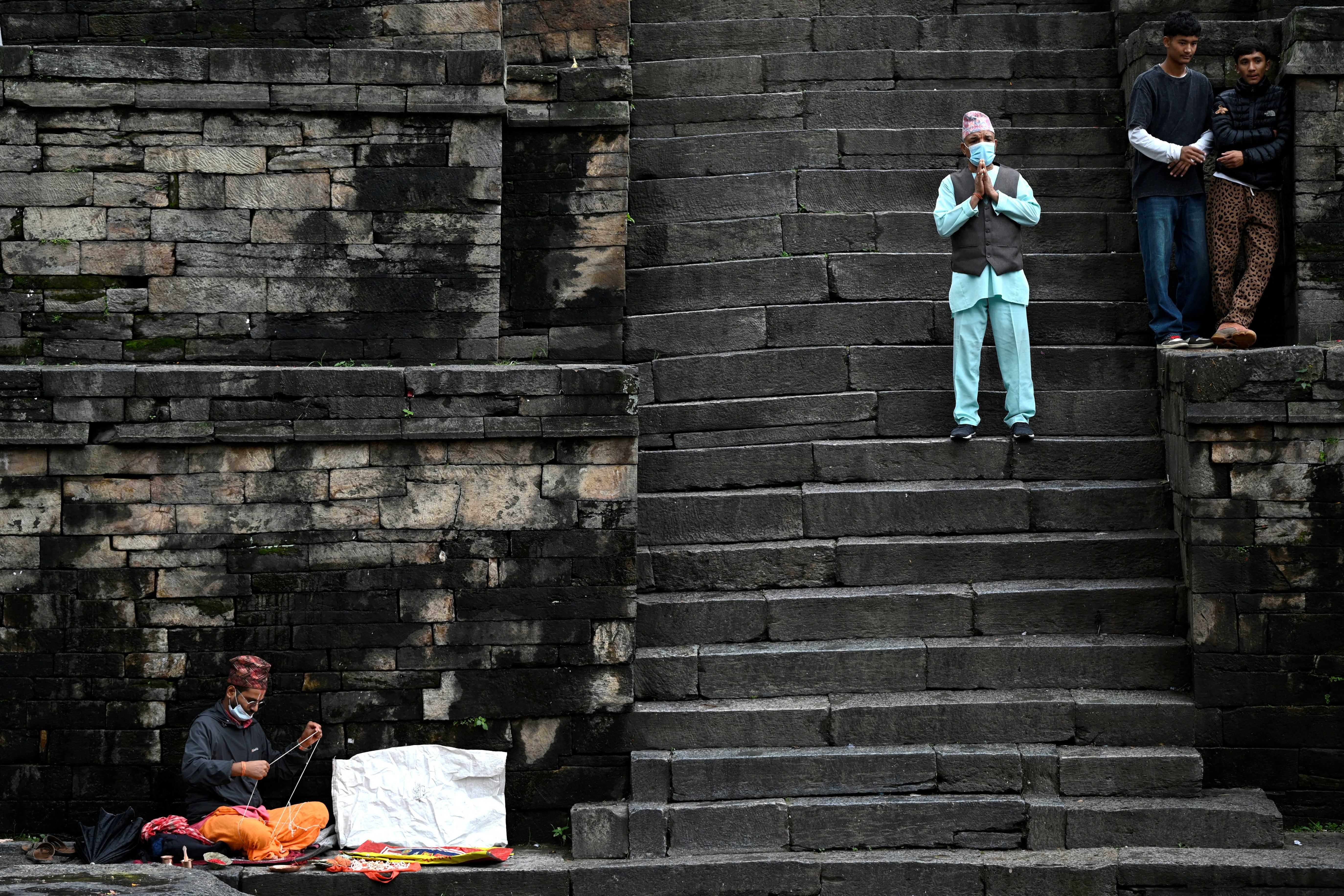 A Hindu priest prepares Rakshyabandhan, sacred threads, on the embankment of the holy Basmati river flowing next to Pashupatinath temple, as a devotee offers prayers to mark the Janai Purnima festival, for protection and purification, in Kathmandu, Nepal, on August 19, 2024. (Photo by Monika Malla/Reuters)