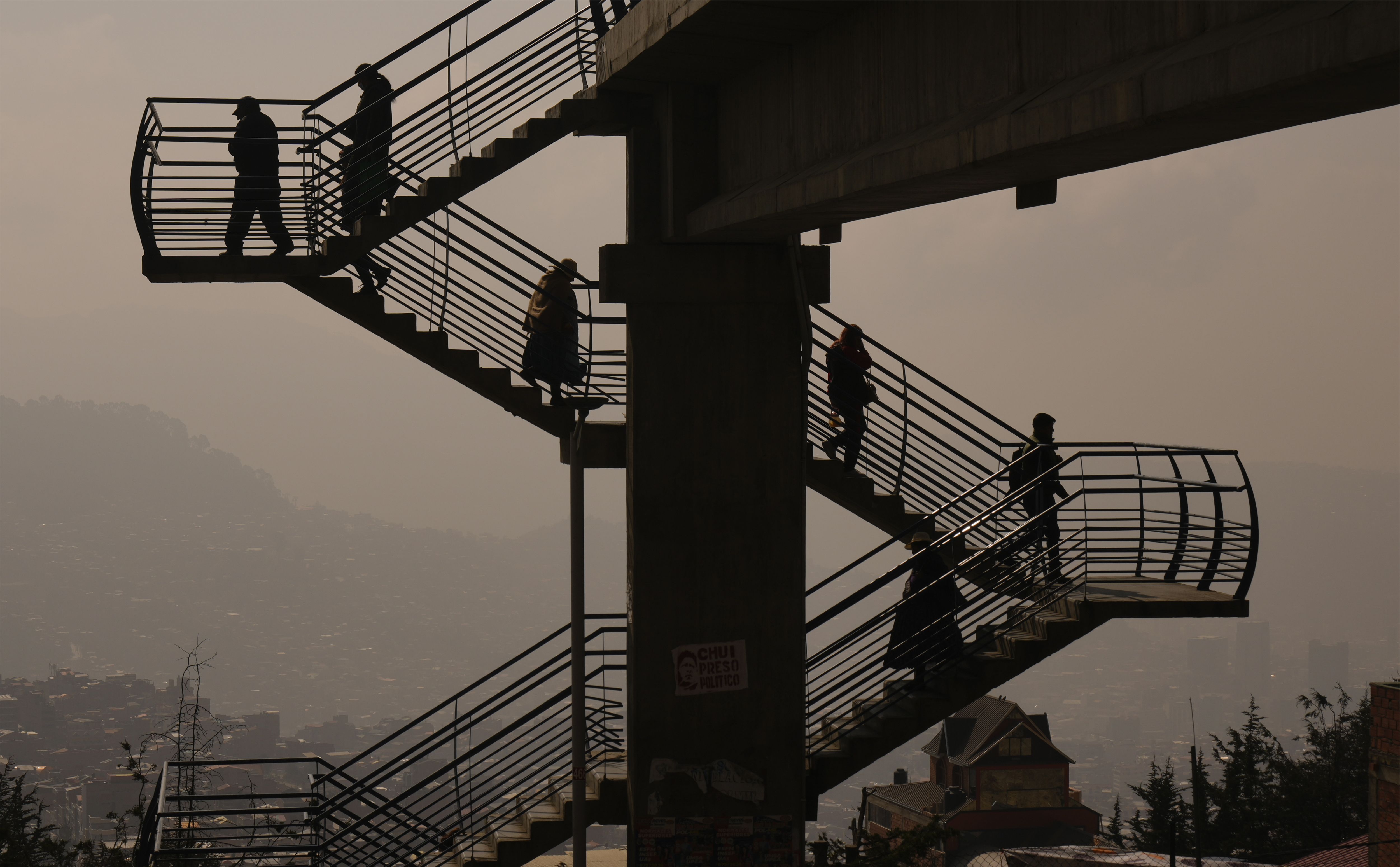 Smoke from fires fills the air in La Paz, Bolivia where pedestrians use stairs that allow them to cross over a road, Thursday, September 5, 2024. (Photo by Juan Karita/AP Photo)
