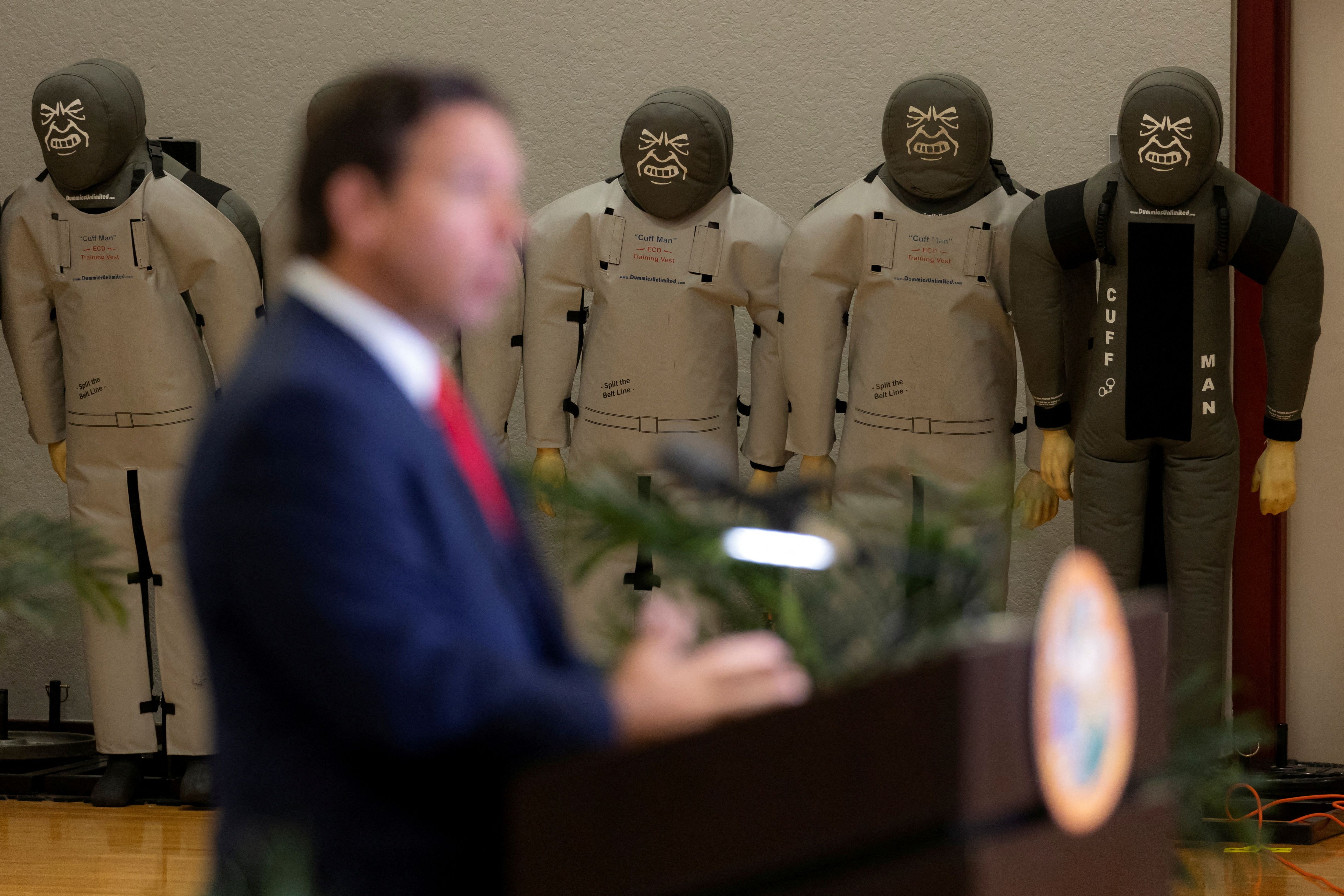 Training dummies are seen as Florida Governor Ron DeSantis speaks during a press conference announcing that Florida law enforcement will launch a criminal investigation of the apparent assassination attempt on Republican presidential nominee and former U.S. President Donald Trump, in West Palm Beach, Florida, U.S. September 17, 2024. (Photo by Marco Bello/Reuters)