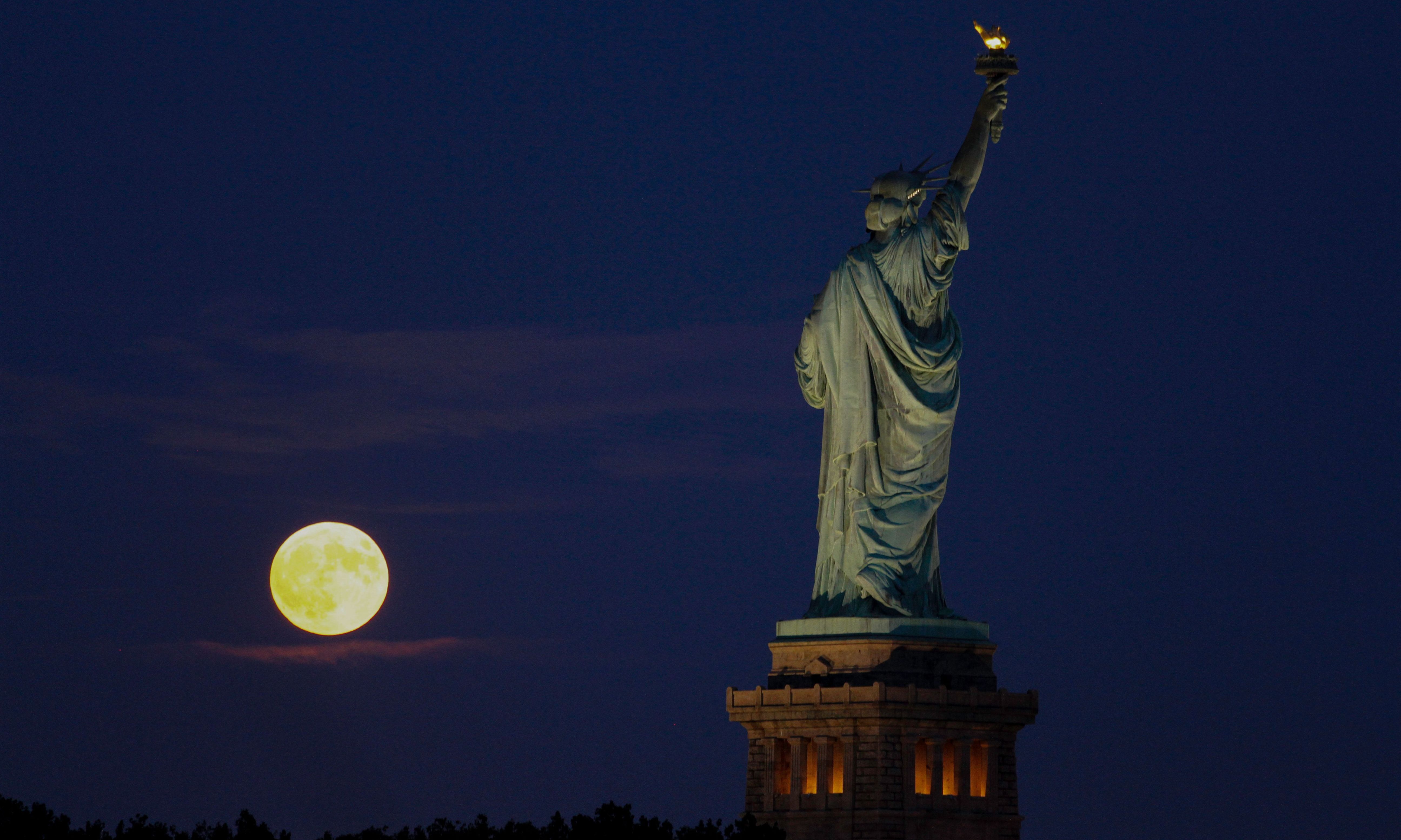 The supermoon, known as the harvest moon in the northern hemisphere, rises behind the Statue of Liberty in New York on September 18, 2024. (Photo by Deccio Serrano/NurPhoto/Rex Features/Shutterstock)