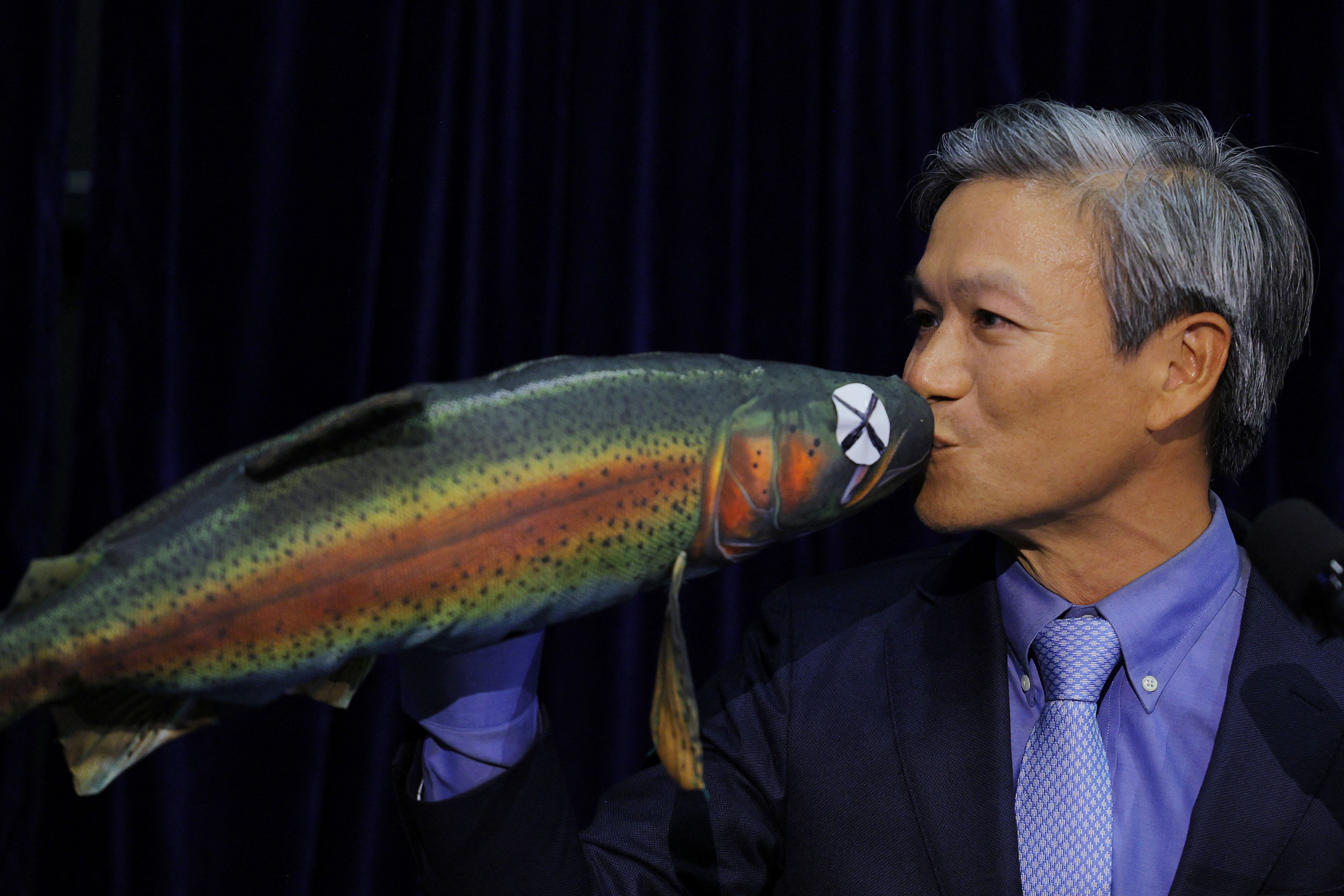 James Liao accepts the Physics Prize for ”Demonstrating and explaining the swimming abilities of a dead trout” during the 34th First Annual IgNobel Prizes ceremony, at the Massachusetts Institute of Technology in Cambridge, Massachusetts, on September 12, 2024. (Photo by Brian Snyder/Reuters)