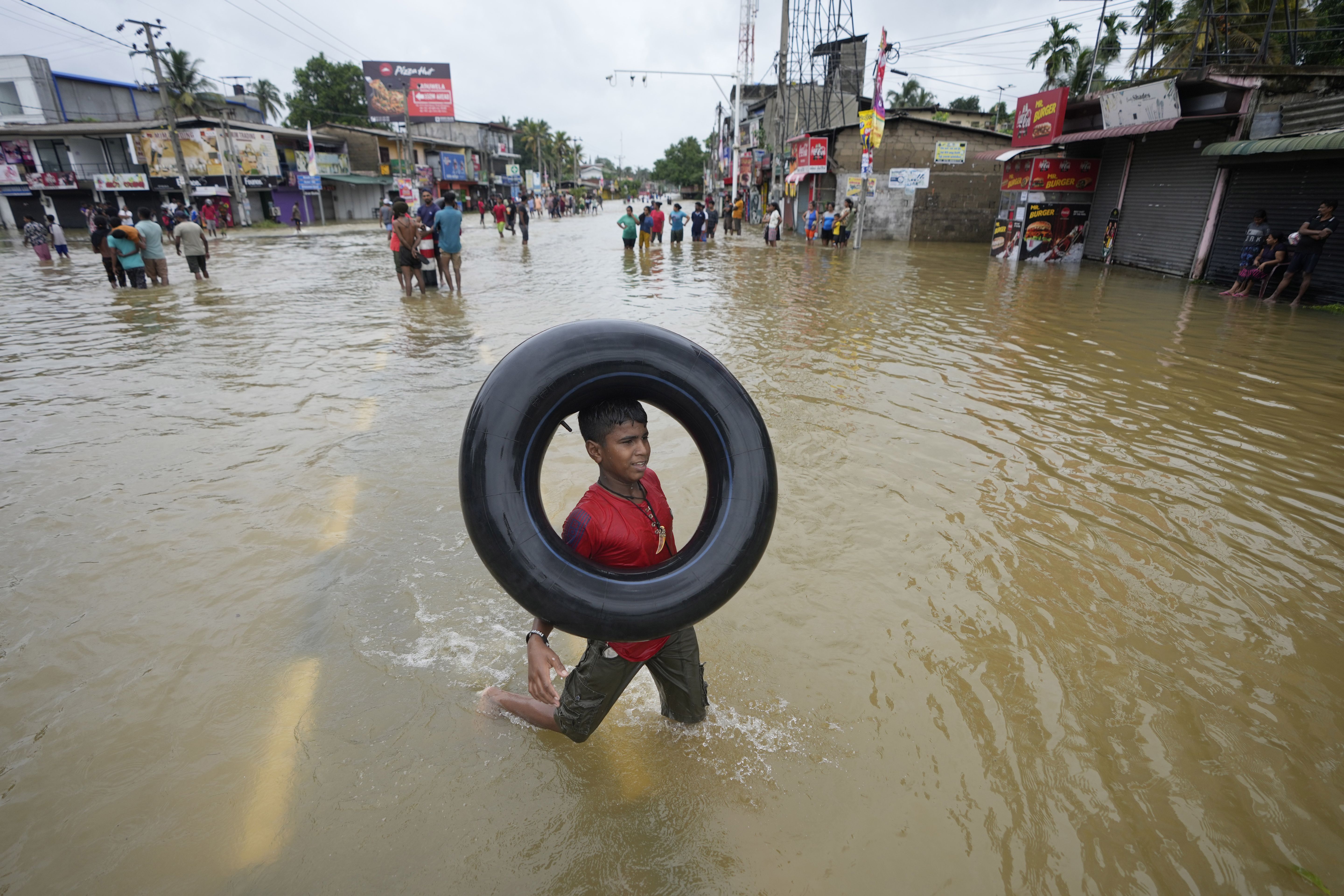 A boy plays with an inflatable rubber tube in a flooded street in Biyagama, a suburb of Colombo, Sri Lanka, Monday, June 3, 2023. Sri Lanka closed schools on Monday as heavy rains triggered floods and mudslides in many parts of the island nation, killing at least 10 people while six others have gone missing, officials said. (Photo by Eranga Jayawardena/AP Photo)