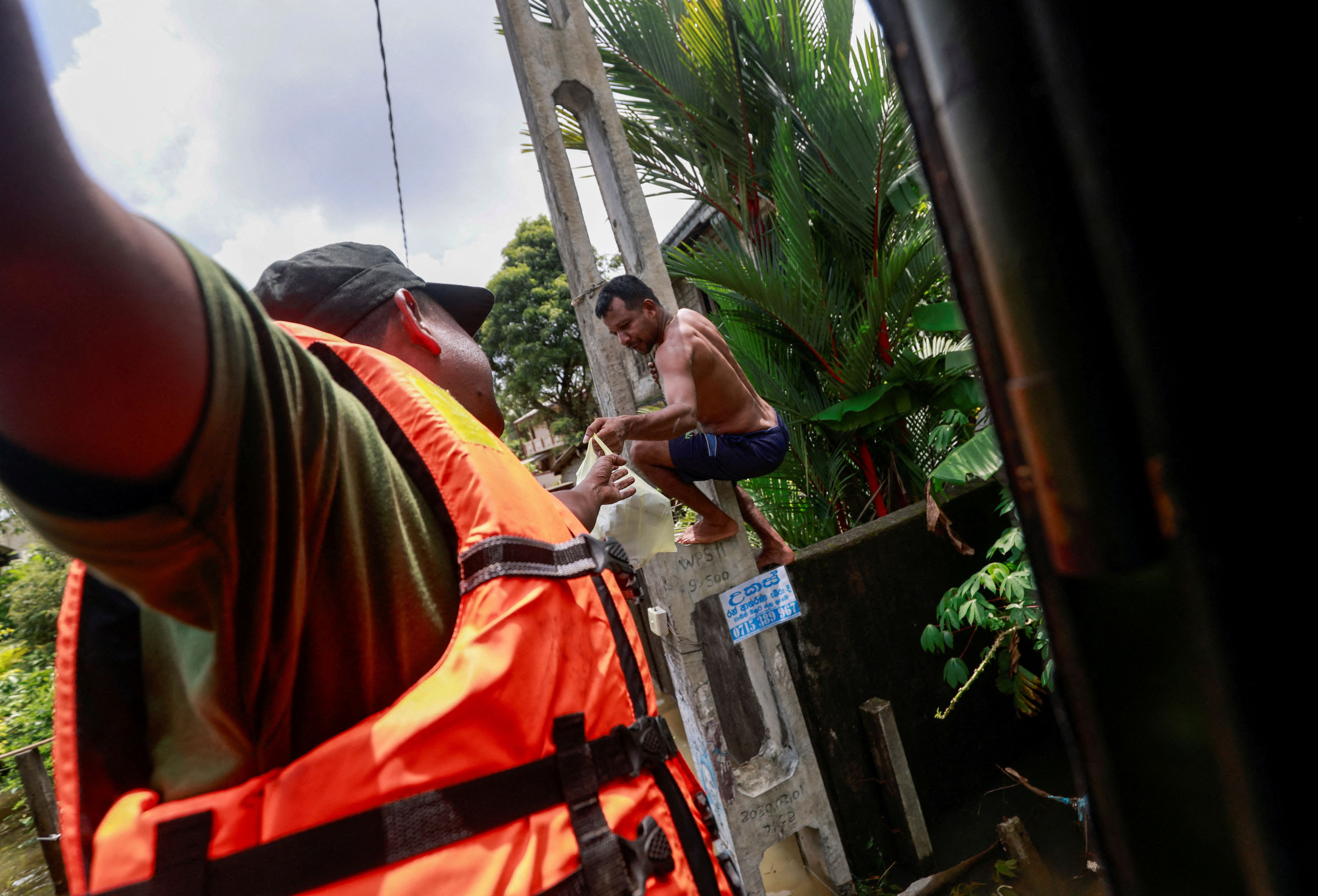 A flood victim hangs on a light post to receive lunch packets for his family on a flooded road from Sri Lankan army members in Kelaniya, Sri Lanka on June 4, 2024. (Photo by Dinuka Liyanawatte/Reuters)