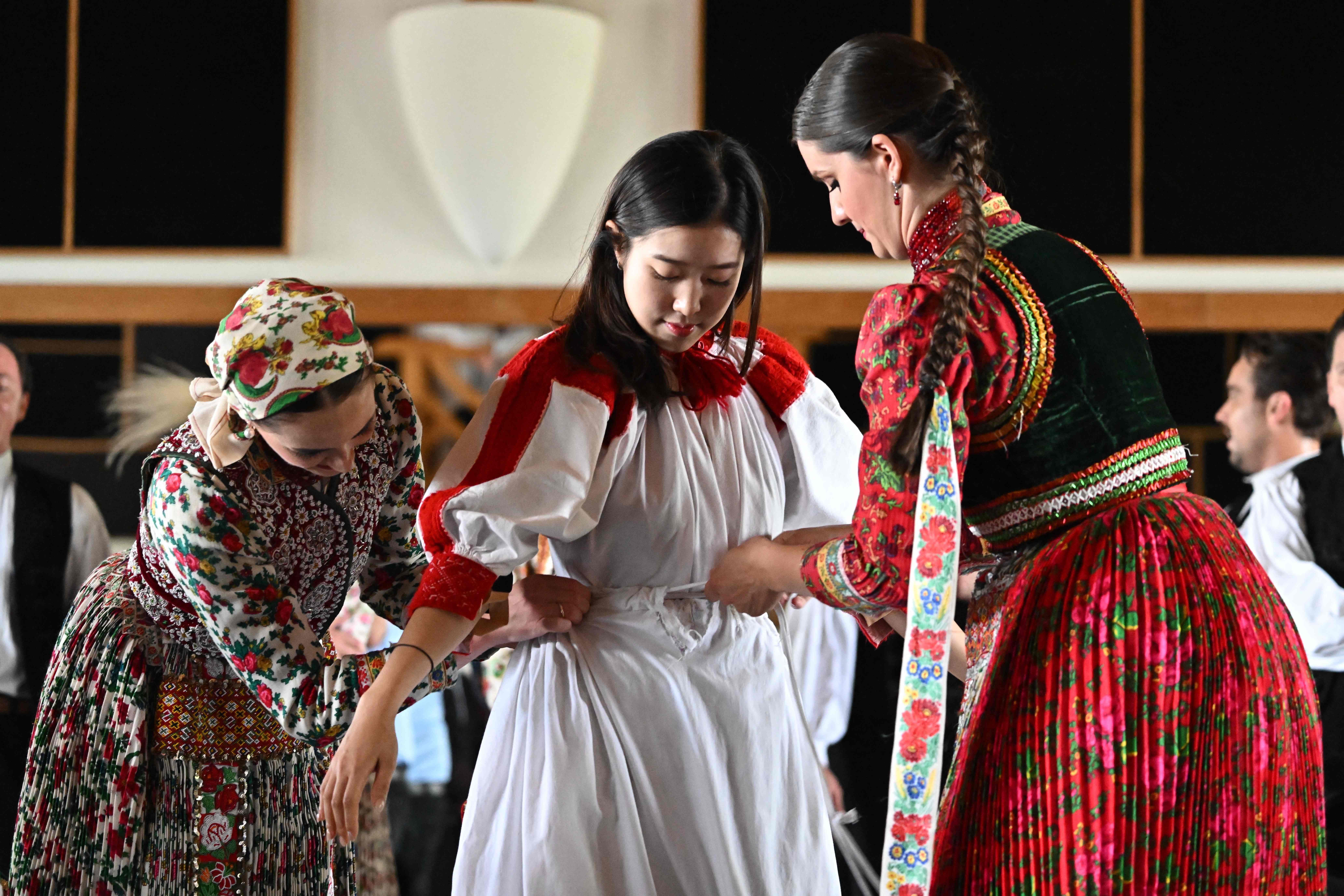Members of the Hungarian National Dance Ensemble dress a member of the South Korean Mutdance dance collective in a Hungarian national costume before their joint rehearsal in Budapest, Hungary, on June 14, 2023. The South Korean group, that has female members only, will perform their programme later at the 10th International Theatre Olympics in Hungary. (Photo by Attila Kisbenedek/AFP Photo)