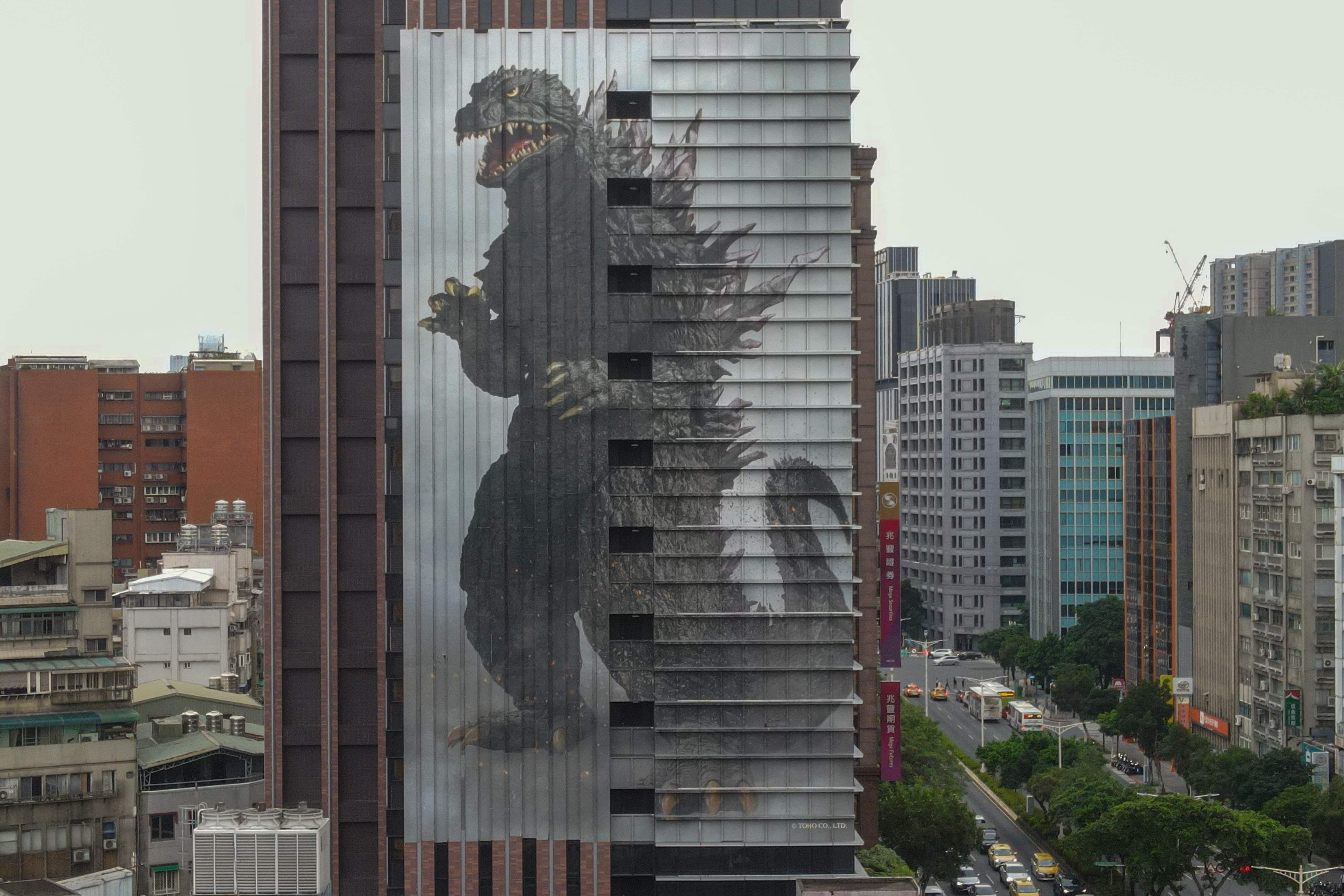 A giant Godzilla poster, which is almost 50 metres tall, is seen outside of a local hotel in Taipei on June 15, 2023. (Photo by Sam Yeh/AFP Photo)